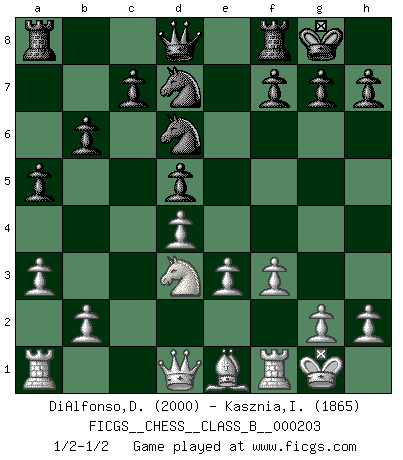 Last move : 1/2-1/2 2014 January 31 9:14:32 [Event "FICGS__CHESS__CLASS_B__000203"] [Site "FICGS"] [Date "2014.01.19"] [Round "1"] [White "DiAlfonso,Darren"] [Black "Kasznia,Ireneusz"] [Result "1/2-1/2"] [WhiteElo "2000"] [BlackElo "1865"] 1.d4 e6 2.c4 d5 3.Nc3 Nf6 4.Nf3 Bb4 5.Bd2 O-O 6.e3 b6 7.cxd5 exd5 8.Bd3 a5 9.a3 Bxc3 10.Bxc3 Ba6 11.O-O Ne4 12.Ne5 Bxd3 13.Nxd3 Nd7 14.f3 Nd6 15.Be1 1/2-1/2 Queen's pawn Kingside Castling by player Black (move 5) Kingside Castling by player White (move 11) This chess game ended in a draw. Follow this game move after move (download)Is Bobby Fischer quite sane ? (Salo Flohr) Immer nach dem besten Zug zu suchen ist ziemlich unpraktisch. (Nigel Short) No hay precio que no valga la pena por la cabellera del Rey enemigo. (Koblentz) Même si l'adversaire joue le coup analysé précédemment, recommencez l'analyse en voyant la nouvelle position. Première règle de Blumenfeld Whenever people agree with me, I always feel I must be wrong. (Oscar Wilde)