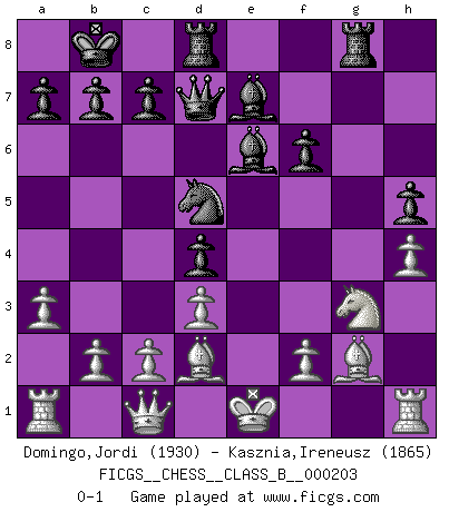 Last move : 0-1 2014 June 15 23:6:24 [Event "FICGS__CHESS__CLASS_B__000203"] [Site "FICGS"] [Date "2014.01.19"] [Round "1"] [White "Domingo,Jordi"] [Black "Kasznia,Ireneusz"] [Result "0-1"] [WhiteElo "1930"] [BlackElo "1865"] 1.g4 d5 2.h3 e5 3.Bg2 h5 4.g5 Be6 5.h4 Nc6 6.d3 Qd7 7.Nc3 O-O-O 8.e4 Nge7 9.Bd2 Kb8 10.exd5 Nxd5 11.Nge2 f6 12.a3 Be7 13.Qc1 Rhf8 14.gxf6 gxf6 15.Ne4 Rg8 16.N4g3 Nd4 17.Nxd4 exd4 0-1 This chess game has been lost on time (started : 2014.01.19 18:42:8) Grob's attack Queenside Castling by player Black (move 7) Player Black won this chess game. Follow this game move after move (download)Chess teaches you to control the initial excitement you feel when you see something that looks good and it trains you to think objectively when you're in trouble. (Stanley Kubrick) Ein typischer, sehr verbreiteter Gedankenschädling ist der, daß der betreffende Amateur von der Annanhme ausgeht, daß jeder einzelne Zug etwas zu leisten habe. (Aaron Nimzowitsch) Cuando tu casa esta en llamas, no puedes ser molestado por tus vecinos. O, como decinos en Ajedrez, si tu Rey esta bajo ataque, no te preocupa perder un Peón del lado de la Reina. (Gary Kasparov) Nous sommes les pions de la mystérieuse partie d'Echecs jouée par Dieu. Il nous déplace, nous arrête, nous pousse encore, puis nous lance un à un dans la boîte du Néant. Epitaphe sur la tombe de David Janowsky (1868-1927). If only faces could talk... (Pat Summerall, Sportscaster during the Super Bowl)