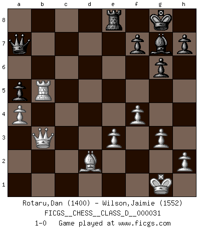 Last move : 1-0 2007 March 30 15:26:35 [Event "FICGS__CHESS__CLASS_D__000031"] [Site "FICGS"] [Date "2007.02.12"] [Round "1"] [White "Rotaru,Dan"] [Black "Wilson,Jaimie"] [Result "1-0"] [WhiteElo "1400"] [BlackElo "1552"] 1.d4 Nf6 2.c4 g6 3.Nf3 Bg7 4.g3 d5 5.cxd5 Nxd5 6.Bg2 O-O 7.O-O Nb6 8.Nc3 Nc6 9.e3 Re8 10.d5 Na5 11.Nd4 Bd7 12.b4 Nac4 13.a4 a5 14.b5 Rb8 15.Qc2 e6 16.dxe6 Bxe6 17.Nxe6 Rxe6 18.Rb1 c6 19.bxc6 bxc6 20.Rd1 Qc7 21.Ne4 R6e8 22.Nd2 Ne5 23.Nf3 Nbc4 24.Rxb8 Qxb8 25.Nxe5 Nxe5 26.f4 Ng4 27.Rd3 Nf6 28.Bd2 Nd5 29.Bxd5 cxd5 30.Rxd5 Qb6 31.Rb5 Qa7 32.Qb3 1-0 King's Indian, 3.Nf3 Kingside Castling by player Black (move 6) Kingside Castling by player White (move 7) Player White won this chess game. Follow this game move after move (download)The blunders are all there on the board, waiting to be made. (Savielly Tartakover) Kombinieren und Schwarzhandel gehören verboten. (Savielly Grigorievitsch Tartakower) La estratégia requiere pensar, la táctica requiere observación. (Max Euwe) Seul un grand joueur sait à quel point il joue faiblement. (Xavier Tartacover) Locking firmely the window serves nothing, only small thiefs pass through there, the big thiefs enter through the front door. (Luc-Olivier Leclerc)