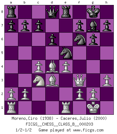 Last move : 1/2-1/2 2014 February 23 3:11:25 [Event "FICGS__CHESS__CLASS_B__000203"] [Site "FICGS"] [Date "2014.01.19"] [Round "1"] [White "Moreno,Ciro"] [Black "Caceres,Julio"] [Result "1/2-1/2"] [WhiteElo "1938"] [BlackElo "2000"] 1.d4 Nf6 2.c4 g6 3.Nc3 Bg7 4.e4 d6 5.Nf3 O-O 6.Bd3 Bg4 7.Be3 Nbd7 8.O-O e5 9.h3 Bxf3 10.Qxf3 exd4 11.Bxd4 Re8 12.Rfe1 Ne5 1/2-1/2 King's Indian : 5.Nf3 Kingside Castling by player Black (move 5) Kingside Castling by player White (move 8) This chess game ended in a draw. Follow this game move after move (download)By the beauty of his games, the clarity of his play, and the brilliance of his ideas, Fischer made himself an artist of the same stature as Brahms, Rembrandt, and Shakespeare. (David Levy) Die Idee von Capablanca, Schach als Fach in den Schulen zu lehren, ist großartig. (Fidel Castro) El estómago es una parte esencial del maestro de Ajedrez. (Bent Larsen) On a dit que l'homme se distingue de l'animal par le fait qu'il achète plus de livres qu'il ne peut en lire. Je voudrais suggérer qu'inclure à la liste des livres quelques livres d'échecs rendrait la distinction manifeste. (Edward Lasker) May I never be complete. May I never be content. May I never be perfect. Deliver me, Tyler, from being perfect and complete. (Chuck Palahniuk, Fight Club)