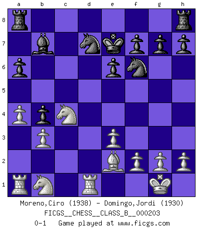 Last move : 0-1 2014 June 6 10:47:28 [Event "FICGS__CHESS__CLASS_B__000203"] [Site "FICGS"] [Date "2014.01.19"] [Round "1"] [White "Moreno,Ciro"] [Black "Domingo,Jordi"] [Result "0-1"] [WhiteElo "1938"] [BlackElo "1930"] 1.d4 d5 2.c4 dxc4 3.e3 Nf6 4.Bxc4 e6 5.Nf3 c5 6.O-O a6 7.dxc5 Qxd1 8.Rxd1 Bxc5 9.Be2 Nbd7 10.b3 b6 11.Ba3 Be7 12.Nfd2 b5 13.Bxe7 Kxe7 14.a4 b4 15.Nc4 Bb7 0-1 This chess game has been lost on time (started : 2014.01.19 18:42:8) Queen's gambit accepted Kingside Castling by player White (move 6) Player Black won this chess game. Follow this game move after move (download)Chess is a beautiful mistress. (Bent Larsen) Woher wissen wir, daß der Neanderthaler Blindschach gespielt hat? -- Bei Ausgrabungen wurden keine Schachbretter und Figuren gefunden. (Anonymous) No es una movida, aún la mejor movida que tu debas buscar, sino un plan comprensible. (Eugene Znosko-Borovsky) Mon pion favori sur ma case favorite ! Bronstein en parlant d'un coup de pion en h5 quand il avait les Noirs. When I took office, only high energy physicists had ever heard of what is called the World Wide Web... Now even my cat has its own page. (Bill Clinton, 1996)