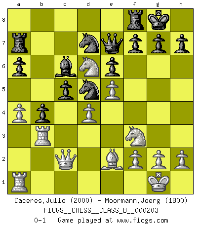 Last move : 0-1 2014 June 4 22:43:24 [Event "FICGS__CHESS__CLASS_B__000203"] [Site "FICGS"] [Date "2014.01.19"] [Round "1"] [White "Caceres,Julio"] [Black "Moormann,Joerg"] [Result "0-1"] [WhiteElo "2000"] [BlackElo "1800"] 1.d4 d5 2.c4 e6 3.Nc3 c6 4.Nf3 dxc4 5.e4 b5 6.Be2 Bb7 7.O-O Nf6 8.a4 a6 9.Qc2 Nbd7 10.Rb1 Be7 11.b3 cxb3 12.Rxb3 b4 13.e5 Nd5 14.Ne4 c5 15.Bg5 O-O 16.Bxe7 Qxe7 17.Nd6 Bc6 18.Ra1 Ra7 0-1 This chess game has been lost on time (started : 2014.01.19 18:42:8) QGD : Semi-Slav, Noteboom variation Kingside Castling by player White (move 7) Kingside Castling by player Black (move 15) Player Black won this chess game. Follow this game move after move (download)The blunders are all there on the board, waiting to be made. (Savielly Tartakover) Kombinieren und Schwarzhandel gehören verboten. (Savielly Grigorievitsch Tartakower) Una victoria por una combinación errónea, aunque sea espectacular, me llena de horror artístico. (Wilhelm Steinitz) Les pièces de l'échiquier étaient impitoyables. Elles le retenaient, elles l'absorbaient. Il y avait de l'horreur en cela, mais aussi une harmonie unique. Car, qu'y a-t-il dans le monde, à part les échecs ? (V. Nabokov) Over-the-board chess is the favorite of mortals, correspondence chess is the favorite of the gods. (Eduard Dyckhoff)