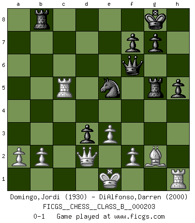 Last move : 0-1 2014 June 22 11:34:5 [Event "FICGS__CHESS__CLASS_B__000203"] [Site "FICGS"] [Date "2014.01.19"] [Round "1"] [White "Domingo,Jordi"] [Black "DiAlfonso,Darren"] [Result "0-1"] [WhiteElo "1930"] [BlackElo "2000"] 1.g4 d5 2.Bg2 Bxg4 3.c4 c6 4.Qb3 e6 5.Qxb7 Nd7 6.Nc3 Ne7 7.cxd5 exd5 8.Qb4 Nf6 9.Qa4 Bd7 10.d3 Ng6 11.h4 h5 12.Nf3 Be7 13.Bg5 Rb8 14.Qxa7 O-O 15.Rb1 Re8 16.Qe3 Ng4 17.Bxe7 Rxe7 18.Qd2 Bf5 19.Rc1 d4 20.Ne4 Bxe4 21.dxe4 Rxe4 22.Ng5 Re5 23.Bxc6 d3 24.e3 Qf6 25.Bg2 Nxh4 26.Rxh4 Rxg5 27.Rc6 Qd8 28.Rh1 Ne5 29.Rc5 Qf6 0-1 This chess game has been lost on time (started : 2014.01.19 18:42:8) Grob : Fritz gambit Kingside Castling by player Black (move 14) Player Black won this chess game. Follow this game move after move (download)Nothing excites jaded Grandmasters more than a theoretical novelty. (Dominic Lawson) Im Blitz ist es einfacher mit einer Figur weniger anzugreifen, als sich mit einer Mehrfigur zu verteidigen. (Mikhail Nekhemyevich Tal) Aquel que ve no otra dirección en el juego que la de dar Jaque Mate a su oponente, nunca será un buen jugador de Ajedrez. (Euwe) Le pion, dans sa simplicité, marche droit devant lui, mais lorsqu'il prend, il le fait obliquement? Ainsi l'homme, tant qu'il reste pauvre, marche dans la droiture et vit honnêtement, mais lorsqu'il recherche les honneurs, il flatte, se parjure et, par les voies obliques, cherche une position supérieure sur l'échiquier du monde. (Jean de Galles) Difficult things take a long time, impossible things a little longer. (Author unknown)