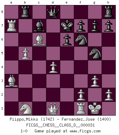 Last move : 1-0 2007 March 31 4:22:44 [Event "FICGS__CHESS__CLASS_D__000031"] [Site "FICGS"] [Date "2007.02.12"] [Round "1"] [White "Piippo,Mikko"] [Black "Fernandez,Jose"] [Result "1-0"] [WhiteElo "1742"] [BlackElo "1400"] 1.Nf3 d5 2.c4 dxc4 3.e4 b5 4.a4 c6 5.b3 Nf6 6.bxc4 Nxe4 7.axb5 cxb5 8.cxb5 e6 9.g3 Bb7 10.Bg2 Nd7 11.Bb2 Ndf6 12.O-O Bd6 13.d3 Nc5 14.d4 Nce4 15.Ng5 Nxg5 16.Bxb7 Rb8 17.Bc6+ Ke7 18.Rxa7+ Bc7 19.Ba3+ 1-0 Reti accepted Kingside Castling by player White (move 12) Player White won this chess game. Follow this game move after move (download)Chess is a sea in which a gnat may drink and an elephant may bathe. (Hindu proverb) Ich rechne überhaupt nicht voraus. Ich gewinne auch so. (Robert James Fischer) Por esta medida (el intervalo entre Fischer y sus contemporaneos), yo le considero el mas grande campeón mundial. (Garry Kasparov) L'ordinateur a tué l'originalité. Il n'y a plus guère d'aventures sur l'échiquier. (Jacob Murray) Either move or be moved. (Ezra Pound)
