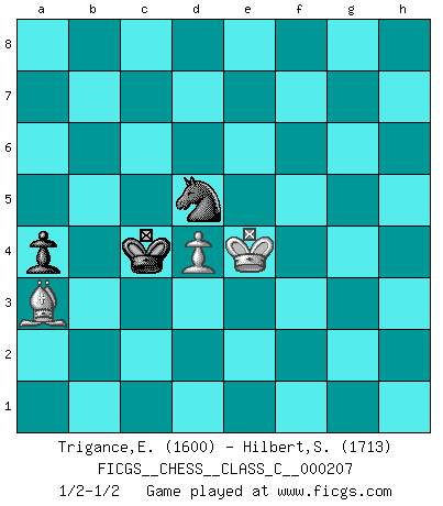 Last move : 1/2-1/2 2014 April 4 10:21:24 [Event "FICGS__CHESS__CLASS_C__000207"] [Site "FICGS"] [Date "2014.01.20"] [Round "1"] [White "Trigance,Emile"] [Black "Hilbert,Stephan J."] [Result "1/2-1/2"] [WhiteElo "1600"] [BlackElo "1713"] 1.e4 d5 2.exd5 Qxd5 3.Nc3 Qa5 4.d4 Nf6 5.Nf3 Bf5 6.Bc4 e6 7.Bd2 c6 8.Qe2 Bb4 9.Ne5 Nbd7 10.Nxd7 Kxd7 11.Bd3 Bg6 12.a3 Bd6 13.Ne4 Qc7 14.Nxd6 Qxd6 15.Bxg6 hxg6 16.O-O-O Rxh2 17.Rxh2 Qxh2 18.Qf3 Rh8 19.Bf4 Qh5 20.Qg3 Qh4 21.Qf3 Nd5 22.Bg3 Qg5+ 23.Kb1 f6 24.Qb3 Nb6 25.Re1 Qd5 26.Qxd5+ cxd5 27.b3 Rh5 28.Kc1 Nc8 29.Kd2 Ne7 30.Kd3 b5 31.c4 dxc4+ 32.bxc4 bxc4+ 33.Kxc4 a6 34.Rb1 Kc6 35.Rb8 Rb5 36.a4 Rxb8 37.Bxb8 Nd5 38.a5 Nc7 39.Ba7 g5 40.Bc5 g4 41.Bf8 g5 42.Be7 Nd5 43.Bc5 f5 44.g3 f4 45.Kd3 Kb5 46.Ke4 Kxa5 47.Ke5 Ne3 48.Kxe6 Kb5 49.Ke5 Kc4 50.gxf4 gxf4 51.Kxf4 Nd1 52.Kg3 a5 53.f4 gxf3 54.Kxf3 a4 55.Kf4 Nc3 56.Ke5 Nd5 57.Ba3 Ne3 58.Bc1 Nd5 59.Ba3 Nb4 60.Ke4 Nd5 1/2-1/2 Scandinavian defense Queenside Castling by player White (move 16) 10 pieces endgame at move 50 : White KBPPP , Black KNPPP WHITE : King + 1 Bishop 3 Pawns BLACK : King + 1 Knight 3 Pawns 9 pieces endgame at move 50 : White KBPP , Black KNPPP WHITE : King + 1 Bishop 2 Pawns BLACK : King + 1 Knight 3 Pawns 8 pieces endgame at move 51 : White KBPP , Black KNPP WHITE : King + 1 Bishop 2 Pawns BLACK : King + 1 Knight 2 Pawns 7 pieces endgame at move 53 : White KBP , Black KNPP WHITE : King + 1 Bishop 1 Pawn BLACK : King + 1 Knight 2 Pawns 6 pieces endgame at move 54 : White KBP , Black KNP WHITE : King + 1 Bishop 1 Pawn BLACK : King + 1 Knight 1 Pawn This chess game ended in a draw. Follow this game move after move (download)When you absolutely don't know what to do anymore, it is time to panic. (John van der Wiel) Du musst Deinen Gegner in einen tiefen dunklen Wald führen wo 2+2=5 ist und wo der Weg, der wieder hinausführt, nur breit genug für einen ist. (Mikhail Nekhemyevich Tal) Yo jugué Ajedrez con el y a veces le pude haber ganado solo que siempre devuelve su última jugada y juega la partida de manera diferente. (Mark Twain) Il n'y a plus de joueurs du niveau de Jacob Murray dont la seule quête est le beau jeu, le plaisir de voir les pièces construire quelque chose. Sur 10 idées à la minute, 9 seront sans intérêt, la dernière s'avèrera géniale. (Christian Bauer) He who defends everything defends nothing. (Frederick the Great)