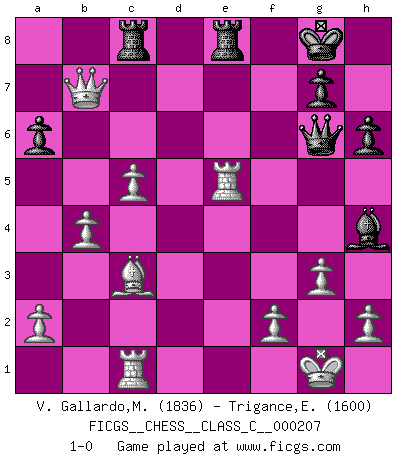 Last move : 1-0 2014 March 13 10:30:8 [Event "FICGS__CHESS__CLASS_C__000207"] [Site "FICGS"] [Date "2014.01.20"] [Round "1"] [White "V. Gallardo,Miguel"] [Black "Trigance,Emile"] [Result "1-0"] [WhiteElo "1836"] [BlackElo "1600"] 1.e4 e6 2.d4 d5 3.e5 c5 4.Nf3 Nc6 5.Bb5 Bd7 6.Bxc6 Bxc6 7.O-O Ne7 8.dxc5 Ng6 9.Be3 Be7 10.Re1 O-O 11.Qd3 Qc7 12.Bd4 Rac8 13.Nbd2 Rfe8 14.b4 a6 15.c4 Qd8 16.Qe3 h6 17.cxd5 Bxd5 18.Ne4 Bxe4 19.Qxe4 f5 20.exf6 Bxf6 21.Rac1 e5 22.Bc3 Nh4 23.Nxh4 Bxh4 24.Qxb7 Qf6 25.g3 Qg6 26.Rxe5 1-0 French : Advance, Nimzovich system Kingside Castling by player White (move 7) Kingside Castling by player Black (move 10) Player White won this chess game. Follow this game move after move (download)Becoming successful at Chess allows you to discover your own personality. That's what I want for the kids I teach. (Saudin Robovic) Matt entspricht nicht immer den Tatsachen. (Savielly Grigorievitsch Tartakower) ¡Examina movidas que hagan daño! Un buen ojo for movidas desvastantes es mucho mas importante que el conocimiento de principios estratégicos. (Purdy) Si rien de grave n'est détecté lors de l'analyse d'une position, on joue alors le coup. Seconde règle de Blumenfeld. There are two kinds of people in the world, my friend. Those who have a loaded gun and those who dig. You dig ! (Blondie in The Good, The Bad and The Ugly)
