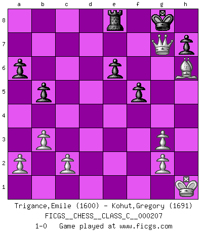 Last move : 1-0 2014 June 13 7:39:38 [Event "FICGS__CHESS__CLASS_C__000207"] [Site "FICGS"] [Date "2014.01.20"] [Round "1"] [White "Trigance,Emile"] [Black "Kohut,Gregory"] [Result "1-0"] [WhiteElo "1600"] [BlackElo "1691"] 1.e4 e6 2.d4 d5 3.Nd2 c5 4.exd5 Qxd5 5.Ngf3 cxd4 6.Bc4 Qd6 7.O-O Nf6 8.Nb3 Nc6 9.Nbxd4 Nxd4 10.Nxd4 a6 11.b3 Qc7 12.Qe2 Bd6 13.Nf5 Bxh2+ 14.Kh1 O-O 15.Nxg7 Be5 16.Bh6 b5 17.Bd3 Bxa1 18.Rxa1 Qc3 19.Rd1 Bd7 20.Be4 Rad8 21.Rd3 Qc7 22.Rg3 Qxg3 23.fxg3 Nxe4 24.Qxe4 f5 25.Qe5 Rf7 26.Nh5 Bc8 27.Nf6+ Kh8 28.Ne8 Kg8 29.Nd6 Re7 30.Qf6 Red7 31.Nxc8 Re8 32.Nd6 Rde7 33.Nxe8 Rxe8 34.Qg7+ 1-0 French : Tarrasch, Open variation Kingside Castling by player White (move 7) Kingside Castling by player Black (move 14) Player White won this chess game. Follow this game move after move (download)Chess is a matter of delicate judgment, knowing when to punch and how to duck. (Bobby Fischer) Nie in meinem Leben habe ich die französische Verteidigung gespielt, welche die Stumpfsinnigste von allen ist. (Wilhelm Steinitz) Evita las multitudes. Haz independientemente tu propio razonamiento. Trata de ser el jugador de Ajedrez, no la pieza de Ajedrez. (Ralph Charell) La vérité est comme le meilleur coup aux échecs : elle existe, mais il faut la chercher. (Arturo Perez-Reverte) Thus, what is of supreme importance in war is to attack the enemy's strategy. (Sun Tzu)