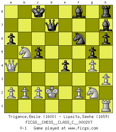 Last move : 0-1 2014 February 16 10:18:7 [Event "FICGS__CHESS__CLASS_C__000207"] [Site "FICGS"] [Date "2014.01.20"] [Round "1"] [White "Trigance,Emile"] [Black "Lipsits,Sasha"] [Result "0-1"] [WhiteElo "1600"] [BlackElo "1659"] 1.e4 e5 2.d4 exd4 3.Bc4 Nc6 4.Nf3 Nf6 5.Ng5 Ne5 6.Qxd4 Qe7 7.Nc3 c5 8.Bxf7+ Nxf7 9.Qc4 Ne5 10.Qe2 h6 11.Nh3 d5 12.Nf4 dxe4 13.h3 Bf5 14.Bd2 O-O-O 15.O-O-O g5 16.g4 Bh7 17.Ng2 Qe6 18.Qb5 a6 19.Qa5 Nc4 20.Qa4 b5 21.Nxb5 Rxd2 22.Rxd2 Nxd2 23.Kxd2 Qd7+ 0-1 Centre game Queenside Castling by player Black (move 14) Queenside Castling by player White (move 15) Player Black won this chess game. Follow this game move after move (download)Before the endgame, the Gods have placed the middle game. (Siegbert Tarrasch) Die Jungen erwarten, dass Opa einfach umfällt. Dann aber kann Opa fünf Stunden lang Schach spielen und die jungen Gegner an die Wand drücken. (Viktor Kortschnoi) En posiciones complicadas, Bobby Fischer pocas veces tuvo que temer de cualquiera. (Paul Keres) Le joueur d'Echecs qui veut atteindre le top est obligé de développer son propre credo créatif. Alexeï Stepanovicth Souétine. Il est facile d'écrire des livres ! Ce qui est difficile, c'est de jouer ! (Alexeï Stepanovicth Souétine) Knowledge will give you power, but character respect. (Bruce Lee)