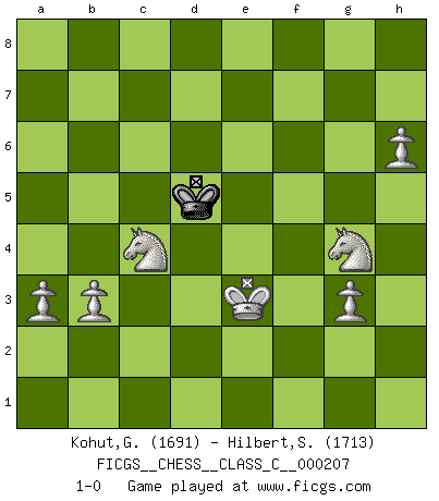 Last move : 1-0 2014 October 31 23:48:9 [Event "FICGS__CHESS__CLASS_C__000207"] [Site "FICGS"] [Date "2014.01.20"] [Round "1"] [White "Kohut,Gregory"] [Black "Hilbert,Stephan J."] [Result "1-0"] [WhiteElo "1691"] [BlackElo "1713"] 1.d4 d5 2.c4 Nf6 3.cxd5 Bf5 4.Nc3 Nxd5 5.Qb3 Nb6 6.e4 Bg6 7.Nf3 e6 8.h4 h6 9.Be3 Nc6 10.Bb5 a6 11.Bxc6+ bxc6 12.Ne5 Bd6 13.Nxc6 Qd7 14.d5 exd5 15.exd5 O-O 16.O-O Qg4 17.Bxb6 cxb6 18.Qa4 Qh5 19.g3 Bd3 20.Rfe1 Kh8 21.Rad1 b5 22.Qd4 Bc2 23.Rd2 Bf5 24.Rde2 Bg4 25.Re3 f5 26.Re6 f4 27.Rxd6 fxg3 28.fxg3 Rf3 29.Re3 Rxe3 30.Qxe3 Re8 31.Rd8 Rxd8 32.Nxd8 Bh3 33.Nc6 Qf7 34.Qf4 Qe8 35.Qb8 Qxb8 36.Nxb8 b4 37.Na4 a5 38.d6 Kg8 39.d7 Bxd7 40.Nxd7 Kf7 41.Nb8 Ke6 42.Nc6 Kd5 43.Nxa5 g5 44.Kf2 g4 45.Ke3 Ke5 46.b3 h5 47.Nb2 Kd5 48.Nd3 Kd6 49.Nxb4 Kc5 50.Nd3+ Kb5 51.Nc4 Kc6 52.Nf4 Kc5 53.a3 Kb5 54.Nxh5 Kc5 55.Nf6 Kc6 56.Nxg4 Kc5 57.h5 Kd5 58.h6 1-0 QGD : Marshall defense Kingside Castling by player Black (move 15) Kingside Castling by player White (move 16) 10 pieces endgame at move 49 : White KNNPPPP , Black KPP WHITE : King + 2 Knights 4 Pawns BLACK : King + 2 Pawns 9 pieces endgame at move 54 : White KNNPPPP , Black KP WHITE : King + 2 Knights 4 Pawns BLACK : King + 1 Pawn 8 pieces endgame at move 56 : White KNNPPPP , Black K WHITE : King + 2 Knights 4 Pawns BLACK : King + Player White won this chess game. Follow this game move after move (download)Help your pieces so they can help you. (Paul Morphy) Schach ist das Spiel, das die Verrückten gesund hält. (Albert Einstein) Las Aperturas te enseñan aperturas. ¡Los Finales te enseñan Ajedrez!. (Stephan Gerzadowicz) Le plus grand jeu de l'esprit jamais inventé, plus vous l'apprenez, plus vous y prenez du plaisir. (Garry Kasparov) You cannot beat a roulette table unless you steal money from it. (Albert Einstein)