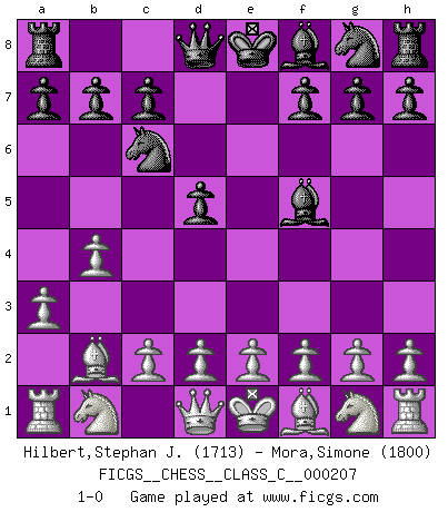 Last move : 1-0 2014 March 12 3:20:34 [Event "FICGS__CHESS__CLASS_C__000207"] [Site "FICGS"] [Date "2014.01.20"] [Round "1"] [White "Hilbert,Stephan J."] [Black "Mora,Simone"] [Result "1-0"] [WhiteElo "1713"] [BlackElo "1800"] 1.b4 e5 2.Bb2 d5 3.Bxe5 Nc6 4.Bb2 Bf5 5.a3 1-0 This chess game has been lost on time (started : 2014.01.20 9:44:0) Polish (Sokolsky) opening Player White won this chess game. Follow this game move after move (download)I prefer to lose a really good game than to win a bad one. (David Levy) Alle Schachspieler sollten auch ein Hobby haben. (Savielly Grigorievitsch Tartakower) El hombre es un frívolo, una creatura engañosa y como un jugador de Ajedrez, se preocupa mas por el proceso de obtener su meta que de la meta por sí misma. (Dostoyevsky) Les ravages du H expliquent la différence de niveau entre Tal et Thal [Abergel]. Art disturbs, science reassures. (Georges Braque, Le Jour et la Nuit)