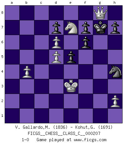 Last move : 1-0 2014 June 24 6:40:19 [Event "FICGS__CHESS__CLASS_C__000207"] [Site "FICGS"] [Date "2014.01.20"] [Round "1"] [White "V. Gallardo,Miguel"] [Black "Kohut,Gregory"] [Result "1-0"] [WhiteElo "1836"] [BlackElo "1691"] 1.d4 Nf6 2.c4 e6 3.Nc3 Bb4 4.f3 O-O 5.Bd2 c5 6.a3 cxd4 7.axb4 dxc3 8.Bxc3 Nc6 9.Qd6 Ne8 10.Qd2 Nf6 11.b5 Ne7 12.c5 b6 13.b4 Qc7 14.e4 Rd8 15.Qd6 Qxd6 16.cxd6 Ng6 17.Bxf6 gxf6 18.Nh3 Bb7 19.Kd2 Rdc8 20.Bd3 Kf8 21.Ra2 Ke8 22.Rha1 e5 23.Nf2 Kf8 24.Ng4 Kg7 25.Ne3 Rcb8 26.Nf5+ Kg8 27.Rxa7 Rxa7 28.Rxa7 Nf8 29.Ra6 Bc8 30.Ne7+ Kg7 31.Nd5 Ne6 32.Rxb6 Rb7 33.Rxb7 Bxb7 34.Nb6 Nf8 35.Bc4 Kg8 36.Bd5 Bxd5 37.exd5 Kg7 38.Nc8 Ng6 39.b6 Nf4 40.Ne7 Nxg2 41.b7 Nh4 42.b8Q Nxf3+ 43.Ke3 Nh4 44.Qg8+ 1-0 Nimzo-Indian : Kmoch variation Kingside Castling by player Black (move 4) Promotion Queen by player White (move 42) Player White won this chess game. Follow this game move after move (download)Before the endgame, the Gods have placed the middle game. (Siegbert Tarrasch) Es ist peinlich, dass ich nie Weltmeister wurde. Es wäre leicht, Leonid Breschnjew als Ursache vorzuschieben, dessen Apparat den Vorzeigekommunisten Anatoli Karpow in allem unterstützte. Aber Garri Kasparow zum Beispiel, der ebenfalls von den Sowjets unerwünscht war, hat trotz der Widerstände den WM-Titel erobert. (Viktor Kortschnoi) El Ajedrez es imaginación. (David Bronstein) Seul un grand joueur sait à quel point il joue faiblement. (Xavier Tartacover) First of all, we have to go back to the classical time control. (Anatoly Karpov)