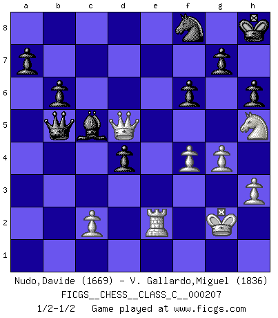 Last move : 1/2-1/2 2014 June 26 18:5:39 [Event "FICGS__CHESS__CLASS_C__000207"] [Site "FICGS"] [Date "2014.01.20"] [Round "1"] [White "Nudo,Davide"] [Black "V. Gallardo,Miguel"] [Result "1/2-1/2"] [WhiteElo "1669"] [BlackElo "1836"] 1.e4 e5 2.Nf3 Nc6 3.Bb5 Nf6 4.O-O Nxe4 5.Re1 Nd6 6.Nxe5 Nxe5 7.Rxe5+ Be7 8.Be2 O-O 9.Bg4 Bf6 10.Re1 Nc4 11.Nc3 d5 12.d3 Ne5 13.Bxc8 Rxc8 14.d4 Ng6 15.h3 c6 16.Qd3 Qb6 17.Be3 Rfe8 18.a4 Re7 19.a5 Qc7 20.a6 b6 21.Bd2 Re6 22.g3 Nf8 23.Ne2 Rce8 24.Nf4 Re4 25.Kg2 Bxd4 26.Rxe4 Rxe4 27.f3 Bxb2 28.Rb1 Rd4 29.Qe3 Rxd2+ 30.Qxd2 Be5 31.Re1 h6 32.Nh5 f6 33.Qe3 Qc8 34.f4 Bd6 35.Qe8 Qf5 36.Re2 d4 37.g4 Qb5 38.Qe4 Qxa6 39.Rd2 Bc5 40.Qxc6 Qa5 41.Qd5+ Kh8 42.Re2 Qb5 43.Re1 Qa4 44.Re2 Qb5 1/2-1/2 Ruy Lopez : Berlin defense, Open variation Kingside Castling by player White (move 4) Kingside Castling by player Black (move 8) This chess game ended in a draw. Follow this game move after move (download)It is not enough to be a good player... you must also play well. (Siegbert Tarrasch) Wenn Dein Gegner dir ein Remis anbietet, versuch herauszufinden, weshalb er glaubt schlechter zu stehen. (Nigel Short) Un mal día en el Ajedrez, es mejor que cualquier buen día en el trabajo. (Anonymous) Il vaut toujours mieux jouer un plan faux de façon logique que de n'avoir pas de plan du tout. (Victor Kortchnoï) Hardware: the parts of a computer that can be kicked. (Jeff Persis)