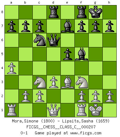 Last move : 0-1 2014 April 5 19:23:7 [Event "FICGS__CHESS__CLASS_C__000207"] [Site "FICGS"] [Date "2014.01.20"] [Round "1"] [White "Mora,Simone"] [Black "Lipsits,Sasha"] [Result "0-1"] [WhiteElo "1800"] [BlackElo "1659"] 1.e4 e5 2.Nc3 Nf6 3.Nf3 Nc6 4.Bc4 Nxe4 5.Nxe4 d5 6.Bxd5 Qxd5 7.d3 Be7 8.Be3 Bf5 9.Nc3 Qd6 10.O-O O-O 11.a4 Rad8 0-1 Vienna : Falkbeer variation Kingside Castling by player White (move 10) Kingside Castling by player Black (move 10) Player Black won this chess game. Follow this game move after move (download)My God, Bobby Fischer plays so simply. (Alexei Suetin) Die FIDE ist dabei in die Hände der russischen Mafia zu fallen. (Larry Evans) No existe un remordimiento como el remordimiento del Ajedrez. (H. G. Wells) Les Echecs, c'est l'art de la guerre sans les charniers, c'est la résurrection des morts tombés au champ d'honneur, l'espoir perpétuel, la suprématie de l'intelligence sur la force, la culture de l'esprit. (F. Szpiner) Life is like internet, nothing interesting, but noone want to leave it. (Ilmars Cirulis)