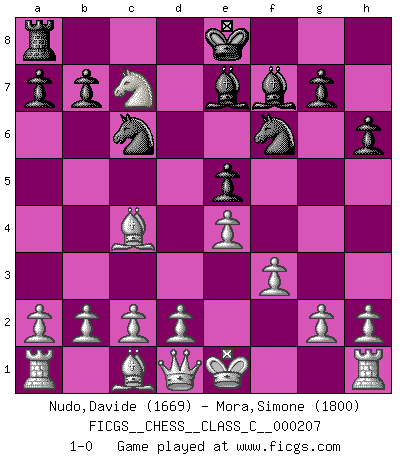 Last move : 1-0 2014 April 6 7:22:51 [Event "FICGS__CHESS__CLASS_C__000207"] [Site "FICGS"] [Date "2014.01.20"] [Round "1"] [White "Nudo,Davide"] [Black "Mora,Simone"] [Result "1-0"] [WhiteElo "1669"] [BlackElo "1800"] 1.e4 e5 2.Nc3 Nc6 3.Bc4 d6 4.Nf3 Nf6 5.Ng5 h6 6.Nxf7 Qe7 7.Nxh8 Bg4 8.Ng6 Bh5 9.Nxe7 Bxe7 10.f3 d5 11.Nxd5 Bf7 12.Nxc7+ 1-0 Vienna game, Max Lange defense Player White won this chess game. Follow this game move after move (download)Your body has to be in top condition. Your Chess deteriorates as your body does. You can't separate body from mind. (Bobby Fischer) Konzentriere dich auf materielle Gewinne. Nimm, was dir dein Gegner gibt, ausser es gibt einen guten Grund der dagegenspricht. (Robert James Fischer) Estaba muy claro de que el punto vulnerable del Gran Maestro Americano (Bobby Fischer) radicaba en las posiciones de doble filo, colgantes, irracionales, donde el siempre falló en encontrar un triunfo aún en una posición de clara victoria. (Efim Geller) Vous savez, camarade Pachman, je n'éprouve pas de plaisir à être ministre, je jouerais plutôt aux échecs comme vous, ou alors ferais une révolution au Venezuela. (Che Guevara à Ludek Pachman, 'Checkmate in Prague', 1975) That's absurd. I love it. (Gregory House, House M.D.)