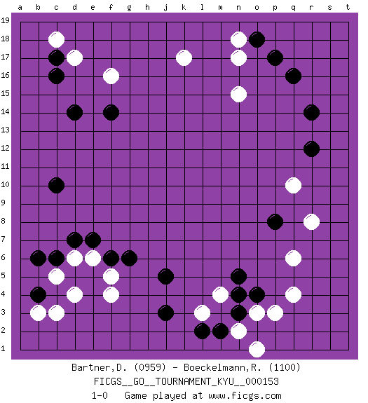Last move : 1-0 2014 March 24 4:47:27 [Event "FICGS__GO__TOURNAMENT_KYU__000153 "] [Site "FICGS"] [Date "2014.01.23"] [Round "1"] [Black "Bartner,Douglas "] [White "Boeckelmann,Raik "] [Result "1-0"] [Rating 1 "0959"] [Rating 2 "1100"] 1.q16 d4 2.c16 q4 3.c6 f4 4.b4 k17 5.j3 l3 6.j5 c3 7.f6 b3 8.c10 q10 9.r14 f16 10.d14 d17 11.c17 c18 12.o4 o3 13.n3 p3 14.n5 m4 15.n4 n2 16.m2 o1 17.l2 q6 18.p8 r8 19.r12 n17 20.p17 n15 21.o18 n18 22.f14 d6 23.d7 e6 24.e7 c5 25.b6 f5 26.g6 1-0 This go game has been lost on time (started : 2014.01.23 7:49:27) Here are the names of the openings (joseki) played in the four corners : Corner d4 : d4 c6Hoshi (Hwajeom, Seongjeom, Xingwei`) 4-4 Point. The star or hoshi (4-4) point, emphasizing influence at the potential expense of territory.Ikken Kakari (Hankan Keolch'im, Yi Gua`jiao~, 1-Space Low Approach). Black 2 is the standard approach move to the 4-4. Corner d16 : c16 f16Komoku (Somok, Xiao~mu`) 3-4 Point. The komoku (3-4) point is the traditional corner enclosure move..Niken Takagakari (Dukan Nop'dakeolch'im, E`r Gaojia, 2-Space High Approch). The great master Honinbo Shuei (1852-1906) favored the two-space high (niken taka-gakari) approach, especially in two stone handicap games. This approach move was very popular in the 1910s. Wu Qingyuan = Go Seigen frequently played this way, considering it a good "whole board" approach. In recent years, O Rissei has often used the two-space high approach. Player Black won this Go (weiqi, baduk) game.Follow this game move after move (download ) Strike at the waist of the knight's move. (Anonymous) Go and wake up your luck. (Persian saying)
