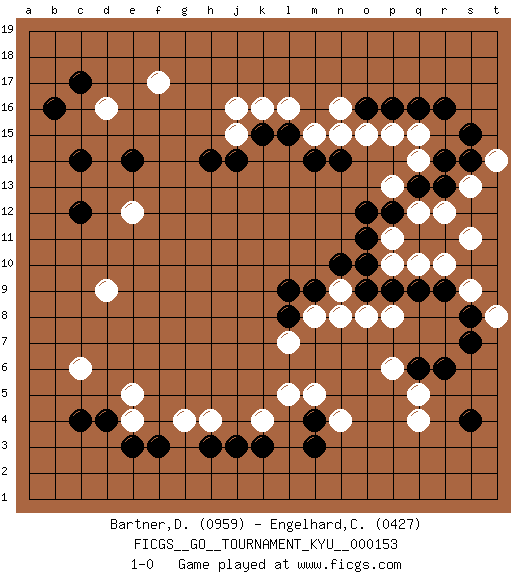 Last move : 1-0 2014 April 13 19:50:18 [Event "FICGS__GO__TOURNAMENT_KYU__000153"] [Site "FICGS"] [Date "2014.01.23"] [Round "1"] [Black "Bartner,Douglas"] [White "Engelhard,Christof"] [Result "1-0"] [Rating 1 "0959"] [Rating 2 "0427"] 1.q16 d16 2.c4 q4 3.f3 p15 4.p16 o15 5.o16 n16 6.r14 q14 7.r13 r12 8.r6 q5 9.q6 p6 10.q9 r10 11.r9 q10 12.m3 n4 13.s4 e12 14.c12 j16 15.c14 d9 16.b16 c6 17.d4 e5 18.j3 h4 19.h3 s11 20.c17 f17 21.e14 l5 22.o9 p8 23.p9 o8 24.m4 m5 25.p12 q12 26.q13 p13 27.o12 s13 28.s14 t14 29.s15 q15 30.r16 s9 31.s8 k4 32.k3 p11 33.o11 p10 34.o10 t8 35.s7 e4 36.e3 g4 37.l9 m8 38.l8 l7 39.m9 n9 40.n10 n8 41.n14 n15 42.m14 m15 43.k15 k16 44.l15 l16 45.h14 j15 46.j14 1-0 This go game has been lost on time (started : 2014.01.23 7:49:27) Here are the names of the openings (joseki) played in the four corners : Corner q16 : q16 p15 Hoshi (Hwajeom, Seongjeom, Xingwei`) 4-4 Point. The star or hoshi (4-4) point, emphasizing influence at the potential expense of territory. Corner q4 : q4 r6 Hoshi (Hwajeom, Seongjeom, Xingwei`) 4-4 Point. The star or hoshi (4-4) point, emphasizing influence at the potential expense of territory. Ikken Kakari (Hankan Keolch'im, Yi Gua`jiao~, 1-Space Low Approach). Black 2 is the standard approach move to the 4-4. Player Black won this Go (weiqi, baduk) game. Follow this game move after move (download)Don't make territory near thickness. (Anonymous) Political correctness is subjecting us to gross incompetence. (Johann Piek)