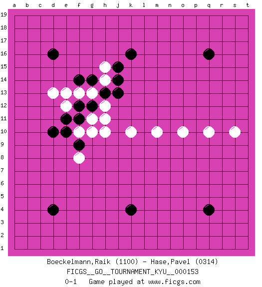 Last move : 0-1 2014 April 10 7:40:22 [Event "FICGS__GO__TOURNAMENT_KYU__000153"] [Site "FICGS"] [Date "2014.01.23"] [Round "1"] [Black "Boeckelmann,Raik"] [White "Hase,Pavel"] [Result "0-1"] [Rating 1 "1100"] [Rating 2 "0314"] 1.d16 k10 2.q4 m10 3.d4 o10 4.q16 q10 5.k16 h10 6.d10 s10 7.k4 f10 8.e10 f8 9.f11 g11 10.f12 g13 11.g12 h12 12.h13 h14 13.j13 h11 14.g14 f13 15.j14 h15 16.j15 e12 17.e11 d13 18.f14 e13 19.f9 g10 0-1 This go game has been lost on time (started : 2014.01.23 7:49:27) Here are the names of the openings (joseki) played in the four corners : Corner d4 : d4 f8 Hoshi (Hwajeom, Seongjeom, Xingwei`) 4-4 Point. The star or hoshi (4-4) point, emphasizing influence at the potential expense of territory. Player White won this Go (weiqi, baduk) game. Follow this game move after move (download)On the third line, four die, six live. (Anonymous) Every now and then a man's mind is stretched by a new idea and never shrinks back to its former dimensions. (Oliver Wendell Holmes, Sr.)