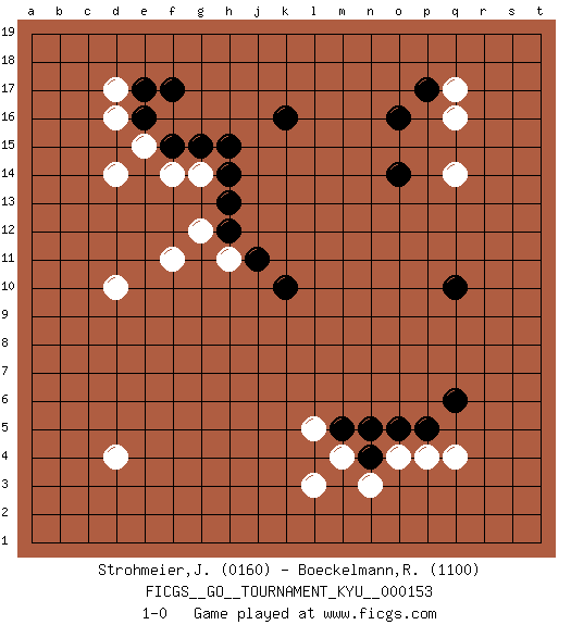 Last move : 1-0 2014 May 13 9:19:28 [Event "FICGS__GO__TOURNAMENT_KYU__000153 "] [Site "FICGS"] [Date "2014.01.23"] [Round "1"] [Black "Strohmeier,Josef "] [White "Boeckelmann,Raik "] [Result "1-0"] [Rating 1 "0160"] [Rating 2 "1100"] 1.k10 q4 2.q10 d16 3.k16 q16 4.o16 q14 5.o14 d4 6.o5 o4 7.q6 d10 8.f17 d14 9.e16 d17 10.e17 e15 11.p5 p4 12.f15 f14 13.g15 g14 14.h15 m4 15.n5 l3 16.m5 l5 17.n4 n3 18.p17 q17 19.h14 g12 20.h12 h11 21.h13 f11 22.j11 1-0 This go game has been lost on time (started : 2014.01.23 7:49:27) Here are the names of the openings (joseki) played in the four corners : Corner q16 : q16 o16Hoshi (Hwajeom, Seongjeom, Xingwei`) 4-4 Point. The star or hoshi (4-4) point, emphasizing influence at the potential expense of territory.Ikken Takagakari (Hankan Nop'dakeolch'im, Yi Gaojia, 1-Space High Approach). White typically responds at 6-4 or 3-10. White 4-10 is played when White finds play on the right side advantageous. White 4-8 or 3-8 may be played when White has support at top. Corner q4 : q4 o5Hoshi (Hwajeom, Seongjeom, Xingwei`) 4-4 Point. The star or hoshi (4-4) point, emphasizing influence at the potential expense of territory. Corner d16 : d16 f17Hoshi (Hwajeom, Seongjeom, Xingwei`) 4-4 Point. The star or hoshi (4-4) point, emphasizing influence at the potential expense of territory.Ikken Kakari (Hankan Keolch'im, Yi Gua`jiao~, 1-Space Low Approach). Black 2 is the standard approach move to the 4-4. Player Black won this Go (weiqi, baduk) game.Follow this game move after move (download ) Always remember, keep the balance. [between territory and influence] (Figaro) Tomorrow's what you make of it. (Horatio Caine, C.S.I. Miami)