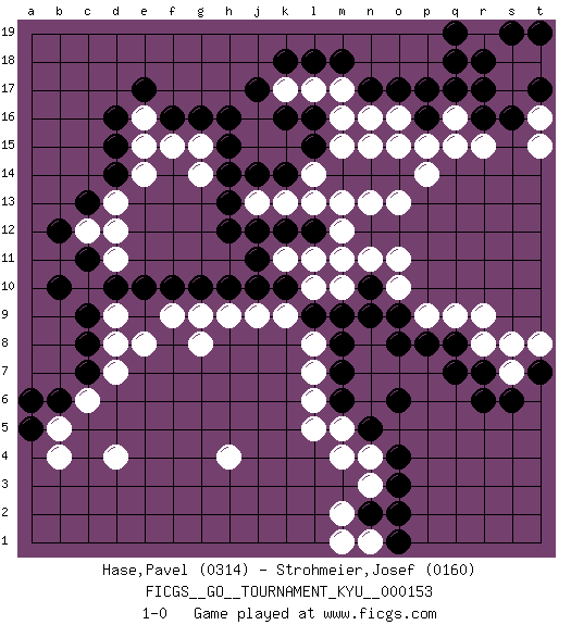 Last move : 1-0 2014 September 28 20:32:58 [Event "FICGS__GO__TOURNAMENT_KYU__000153"] [Site "FICGS"] [Date "2014.01.23"] [Round "1"] [Black "Hase,Pavel"] [White "Strohmeier,Josef"] [Result "1-0"] [Rating 1 "0314"] [Rating 2 "0160"] 1.d10 d4 2.f10 g8 3.h10 j9 4.h12 k11 5.h14 l14 6.h16 e8 7.k16 m16 8.f16 k13 9.k18 d9 10.b10 l17 11.k14 l13 12.l15 m15 13.m18 m17 14.n17 n16 15.o17 o16 16.p16 p15 17.q17 q16 18.p17 r17 19.m14 m13 20.n14 o13 21.o14 p14 22.l18 o15 23.k10 k9 24.j10 l10 25.j11 h9 26.k12 l11 27.l12 m12 28.j12 n13 29.m7 l6 30.m6 m5 31.n5 l5 32.o6 l7 33.m8 l8 34.m9 m10 35.n10 m11 36.n9 o10 37.o9 o11 38.l9 g9 39.g10 f9 40.e10 n4 41.o4 m4 42.o3 n3 43.n2 m2 44.o2 p9 45.p8 q9 46.q8 r8 47.r7 s7 48.s6 s8 49.t7 t8 50.r6 r9 51.q7 n11 52.o8 h4 53.c9 d8 54.c8 d7 55.c7 c6 56.b6 b5 57.a5 b4 58.a6 d11 59.c11 d12 60.c13 d13 61.d14 e14 62.d15 c12 63.b12 e15 64.d16 e16 65.e17 f15 66.g16 g15 67.h15 g14 68.h13 j13 69.j14 n15 70.l16 k17 71.j17 n1 72.o1 m1 73.r18 s18 74.q18 r19 75.r16 s17 76.q19 q15 77.s19 t18 78.s16 t16 79.t19 r15 80.t17 t15 81.r17 1-0 This go game has been lost on time (started : 2014.01.23 7:49:27) Here are the names of the openings (joseki) played in the four corners : Corner q4 : m7 l6 This joseki is unknown. A weak or weird move has probably been played in this corner. Player Black won this Go (weiqi, baduk) game. Follow this game move after move (download)Don't make territory near thickness. (Anonymous) You must have a dream in order to have it come true. (A.P.J. Kalam)
