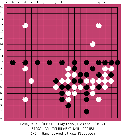 Last move : 1-0 2014 May 6 20:57:30 [Event "FICGS__GO__TOURNAMENT_KYU__000153"] [Site "FICGS"] [Date "2014.01.23"] [Round "1"] [Black "Hase,Pavel"] [White "Engelhard,Christof"] [Result "1-0"] [Rating 1 "0314"] [Rating 2 "0427"] 1.q10 d4 2.o10 d16 3.m10 l9 4.k10 q4 5.h10 q16 6.f10 e7 7.d10 d9 8.b10 p13 9.s10 r9 10.q8 r8 11.s8 r7 12.q6 r6 13.o8 s7 14.r10 s9 15.t10 q7 16.o6 p5 17.o4 p6 18.o2 o7 19.n7 p7 20.p9 n6 21.o5 m8 22.n8 m6 23.m7 l7 24.m9 l8 25.l6 l5 26.k6 k7 27.j7 j6 28.k5 m5 29.k4 l4 30.l3 1-0 This go game has been lost on time (started : 2014.01.23 7:49:27) Here are the names of the openings (joseki) played in the four corners : Player Black won this Go (weiqi, baduk) game. Follow this game move after move (download)Don't be greedy ! (Anonymous) The question of whether computers can think is just like question of whether submarines can swim. (Edsger W. Dijkstra)