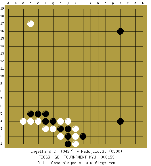 Last move : 0-1 2014 February 8 11:21:30 [Event "FICGS__GO__TOURNAMENT_KYU__000153"] [Site "FICGS"] [Date "2014.01.23"] [Round "1"] [Black "Engelhard,Christof"] [White "Radojcic,Sasa"] [Result "0-1"] [Rating 1 "0427"] [Rating 2 "0500"] 1.q16 c4 2.q4 d17 3.d5 d4 4.e5 e4 5.f4 f3 6.g4 g3 7.h3 h2 8.l2 h4 9.j3 j4 10.f5 k3 11.j2 k2 12.j1 k1 0-1 Here are the names of the openings (joseki) played in the four corners : Corner d4 : c4 d5 Komoku (Somok, Xiao~mu`) 3-4 Point. The komoku (3-4) point is the traditional corner enclosure move.. Player White won this Go (weiqi, baduk) game. Follow this game move after move (download)Six eyes in a rectangle are alive. (Anonymous) For a mechanic, you seem to do an excessive amount of thinking. (C-3PO in Star Wars ep.2)