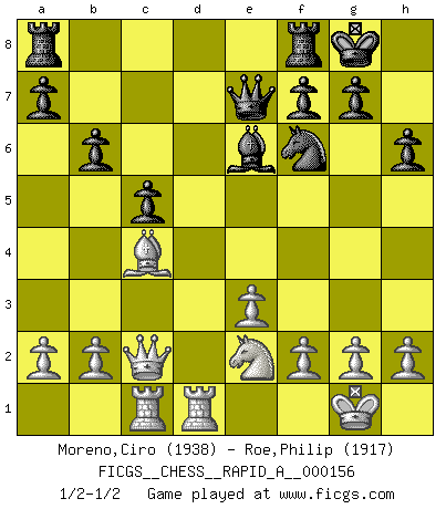 Last move : 1/2-1/2 2014 March 7 1:33:12 [Event "FICGS__CHESS__RAPID_A__000156"] [Site "FICGS"] [Date "2014.01.24"] [Round "1"] [White "Moreno,Ciro"] [Black "Roe,Philip"] [Result "1/2-1/2"] [WhiteElo "1938"] [BlackElo "1917"] 1.d4 d5 2.c4 e6 3.Nc3 Be7 4.Nf3 Nf6 5.Bg5 h6 6.Bxf6 Bxf6 7.e3 O-O 8.Rc1 c6 9.Bd3 Nd7 10.O-O dxc4 11.Bxc4 e5 12.Ne4 exd4 13.Nxf6+ Nxf6 14.Nxd4 Qe7 15.Qc2 c5 16.Ne2 b6 17.Rfd1 Be6 1/2-1/2 QGD : Charousek (Petrosian) variation Kingside Castling by player Black (move 7) Kingside Castling by player White (move 10) This chess game ended in a draw. Follow this game move after move (download)Morphy was probably the greatest genius of them all. (Bobby Fischer) Es ist im Leben wie im Schachspiel. Wir entwerfen einen Plan, dieser bleibt jedoch bedingt durch das, was im Schachspiel dem Gegner, im Leben dem Schicksal zu tun belieben wird. (Arthur Schopenhauer) La táctica fluye a partir de una posición superior. (Bobby Fischer) La vie est comme un jeu d'échecs : nous esquissons un plan, mais celui-ci est tributaire de ce que daignent faire l'adversaire aux échecs et le destin dans la vie. (Arthur Schopenhauer) The intuitive mind is a sacred gift; the rational mind is a faithful servant. We have created a society that honors the servant but has forgotten the gift. (Albert Einstein)