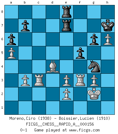 Last move : 0-1 2014 June 4 22:43:24 [Event "FICGS__CHESS__RAPID_A__000156"] [Site "FICGS"] [Date "2014.01.24"] [Round "1"] [White "Moreno,Ciro"] [Black "Boissier,Lucien"] [Result "0-1"] [WhiteElo "1938"] [BlackElo "1910"] 1.d4 f5 2.Nf3 g6 3.g3 Bg7 4.Bg2 Nf6 5.O-O d6 6.c4 O-O 7.Nc3 Qe8 8.Rb1 e5 9.b3 Na6 10.dxe5 dxe5 11.Ba3 c5 12.Qd2 e4 13.Ng5 Bd7 14.Nd5 Bc6 15.Nf4 Bh6 16.h4 e3 17.Qxe3 Qxe3 18.fxe3 Bxg2 19.Kxg2 Ng4 20.Nd5 Rae8 21.Rf3 Bxg5 22.hxg5 Rf7 23.Rh1 Nc7 24.Bxc5 Nxd5 25.cxd5 Rd7 26.Bd4 Rxd5 27.Rc1 Rd7 28.a4 a6 29.Rc3 Rde7 30.a5 h5 31.gxh6 Kh7 0-1 This chess game has been lost on time (started : 2014.01.24 13:41:28) Dutch Kingside Castling by player White (move 5) Kingside Castling by player Black (move 6) Player Black won this chess game. Follow this game move after move (download)Strategy requires thought, tactics require observation. (Max Euwe) Kasparov stellt für gewöhnlich die Regeln auf und bricht sie dann selbst wieder. (Alexej Shirov) Prefiero perder una partida realmente buena, que ganar una mala. (David Levy) Le jeu d'échecs est comme rejeté hors du temps. (Antoine de Saint-Exupéry) All men can see these tactics whereby I conquer, but what none can see is the strategy out of which victory is evolved. (Sun Tzu)