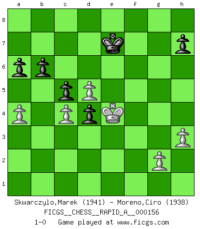 Last move : 1-0 2014 June 1 10:13:45 [Event "FICGS__CHESS__RAPID_A__000156"] [Site "FICGS"] [Date "2014.01.24"] [Round "1"] [White "Skwarczylo,Marek"] [Black "Moreno,Ciro"] [Result "1-0"] [WhiteElo "1941"] [BlackElo "1938"] 1.d4 Nf6 2.Nf3 g6 3.c4 Bg7 4.Nc3 O-O 5.e4 d6 6.Be2 c5 7.d5 Bg4 8.O-O Nbd7 9.h3 Bxf3 10.Bxf3 Ne8 11.Qc2 Be5 12.Bh6 Bg7 13.Bxg7 Nxg7 14.Bg4 a6 15.f4 Nf6 16.a4 e5 17.fxe5 dxe5 18.Qe2 Nfe8 19.Qe3 Nd6 20.b3 Qa5 21.Rf6 Nde8 22.Rf2 Nd6 23.Raf1 Qb4 24.Bd1 f5 25.exf5 Ngxf5 26.Qe1 b6 27.Bg4 Qxb3 28.Ne4 Nxe4 29.Qxe4 Qc3 30.Bxf5 gxf5 31.Rxf5 Qd4+ 32.Qxd4 exd4 33.Rxf8+ Rxf8 34.Rxf8+ Kxf8 35.Kf2 Kf7 36.Kf3 Ke7 37.Ke4 1-0 This chess game has been lost on time (started : 2014.01.24 13:41:28) King's Indian : East Indian defense Kingside Castling by player Black (move 4) Kingside Castling by player White (move 8) Player White won this chess game. Follow this game move after move (download)For surely of all the drugs in the world, Chess must be the most permanently pleasurable. (Assiac) Ein Schachspiel besteht aus drei Phasen: Die erste, wenn du hofftst den Vorteil zu haben, die zweite, wenn du glaubst einen Vorteil zu haben, und die dritte.... wenn du weißt Du wirst verlieren. (Savielly Grigorievitsch Tartakower) Tu puedes aprender mucho mas de una partida que pierdas que de una partida ganada. Tendras que perder cientos de partidas antes de llegar a ser un buen jugador. (Jose Raul Capablanca) Mais n'est-ce pas déjà le limiter injurieusement que d'appeler les échecs un jeu? N'est-ce pas aussi une science, un art, ou quelque chose qui, comme le cercueil de Mahomet entre ciel et terre, est suspendu entre l'un et l'autre, et qui réunit un nombre incroyable de contraires ? (Stefan Zweig) But they are useless. They can only give you answers. (Pablo Picasso, about computers)