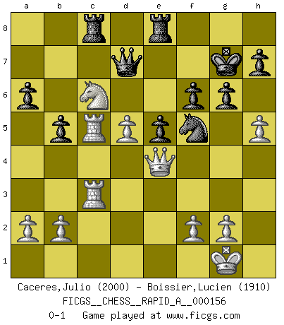 Last move : 0-1 2014 June 2 22:15:19 [Event "FICGS__CHESS__RAPID_A__000156"] [Site "FICGS"] [Date "2014.01.24"] [Round "1"] [White "Caceres,Julio"] [Black "Boissier,Lucien"] [Result "0-1"] [WhiteElo "2000"] [BlackElo "1910"] 1.d4 d5 2.c4 c6 3.Bf4 Nf6 4.e3 a6 5.Nf3 e6 6.Nc3 Nbd7 7.Bd3 dxc4 8.Bxc4 b5 9.Be2 Bb7 10.Ne5 c5 11.Bf3 Bxf3 12.Qxf3 cxd4 13.exd4 Bb4 14.O-O Bxc3 15.Qxc3 O-O 16.Nc6 Qb6 17.Rac1 Nd5 18.Qg3 Rfc8 19.Bh6 g6 20.Qd6 Rc7 21.h4 Re8 22.Rfe1 N7f6 23.Rc5 Ng4 24.Qxd5 Nxh6 25.Qd6 Kg7 26.h5 R7c8 27.Qe5+ f6 28.Qe4 Qb7 29.d5 e5 30.Re3 Nf5 31.Rec3 Qd7 0-1 This chess game has been lost on time (started : 2014.01.24 13:41:28) QGD Slav defense Kingside Castling by player White (move 14) Kingside Castling by player Black (move 15) Player Black won this chess game. Follow this game move after move (download)Checkers is for tramps. (Paul Morphy) Weshalb minderdergeübte Spieler mit g2-g4 beginnen? Die betreffenden sind unschlüssig, ob sie nun rechts (h4) oder links (f4) beginnen sollen, und in ihrer Ratlosigkeit entschliessen sie sich nach guter Bürgerart dazu, den goldenen Mittelweg zu wählen. (Aaron Nimzowitsch) El Ajedrez es sobre todo, ¡una pelea!. (Emanuel Lasker) Le système Elo représente seulement une moyenne. Il est simplement un indicateur de votre stabilité. (Anatoli Karpov) The good fighters of old first put themselves beyond the possibility of defeat, and then waited for an opportunity of defeating the enemy. (Sun Tzu)