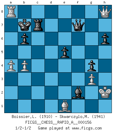 Last move : 1/2-1/2 2014 April 10 17:53:10 [Event "FICGS__CHESS__RAPID_A__000156"] [Site "FICGS"] [Date "2014.01.24"] [Round "1"] [White "Boissier,Lucien"] [Black "Skwarczylo,Marek"] [Result "1/2-1/2"] [WhiteElo "1910"] [BlackElo "1941"] 1.e4 c5 2.Nf3 Nc6 3.Bd3 g6 4.c3 Bg7 5.O-O Nf6 6.Bc2 d5 7.e5 Nd7 8.d4 O-O 9.Re1 e6 10.h3 cxd4 11.cxd4 f6 12.exf6 Nxf6 13.Nc3 a6 14.Bg5 Qd6 15.Rc1 Bd7 16.a3 Nh5 17.Be3 Rac8 18.Ng5 Nf4 19.g3 h6 20.Nf3 Nxh3+ 21.Kg2 g5 22.Qd3 Rf5 23.Rh1 Rxf3 24.Qh7+ Kf8 25.Kxf3 e5 26.Kg2 Nxd4 27.Rxh3 Bxh3+ 28.Kxh3 Qe6+ 29.Kh2 Nxc2 30.Rxc2 d4 31.Bd2 dxc3 32.Bxc3 Rc6 33.Bb4+ Kf7 34.Rd2 g4 35.Kg2 Kf6 36.a4 Rb6 37.Bc3 Rd6 38.Re2 Rd5 39.Re4 Kf7 40.Rc4 Rd7 41.Rb4 a5 42.Re4 Ke8 43.b3 b6 44.Rc4 Bf8 45.Rc8+ Rd8 46.Rc7 Rd1 47.Kh2 Qf6 48.Be1 Qe6 49.Ra7 Be7 50.Ra8+ Rd8 51.Qh8+ Kd7 52.Ra7+ Kc8 53.Qh7 Rd7 54.Ra8+ Kb7 55.Qh8 Rc7 56.Bxa5 Bc5 57.Be1 Qf7 58.b4 Bxf2 1/2-1/2 Sicilian defense Kingside Castling by player White (move 5) Kingside Castling by player Black (move 8) This chess game ended in a draw. Follow this game move after move (download)One of these modest little moves may be more embarrassing to your opponent than the biggest threat. (Siegbert Tarrasch) Ein guter Spieler hat immer Glück. (José Raúl Capablanca) La táctica fluye a partir de una posición superior. (Bobby Fischer) À la honte des hommes, on sait que les lois du jeu sont les seules qui soient partout justes, claires, inviolables et exécutées. Pourquoi l'Indien qui a donné les règles du jeu d'échecs est-il obéi de bon gré dans toute la terre, et que les décrétales des papes, par exemple, sont aujourd'hui un objet d'horreur et de mépris ? C'est que l'inventeur des échecs combina tout avec justesse pour la satisfaction des joueurs, et que les papes, dans leurs décrétales, n'eurent en vue que leur seul avantage. L'Indien voulut exercer également l'esprit des hommes et leur donner du plaisir; les papes ont voulu abrutir l'esprit des hommes. Voltaire (Dictionnaire philosophique / Garnier 1967) . 'gn is not allowed in chess unless n is an integer between 1 and 8 inclusive, where 1 and 8 are to interpreted as the standard numerals standing for integers in the ordered real-closed field R, with the *canonical* ordering. (As opposed to, say, an integer in the domain Z[2+i*sqrt(5)] or an integer in some exotic Grothendieck topos). (Normajean Yates)