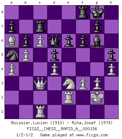 Last move : 1/2-1/2 2014 February 8 11:22:29 [Event "FICGS__CHESS__RAPID_A__000156"] [Site "FICGS"] [Date "2014.01.24"] [Round "1"] [White "Boissier,Lucien"] [Black "Riha,Josef"] [Result "1/2-1/2"] [WhiteElo "1910"] [BlackElo "1974"] 1.d4 d5 2.Nf3 Nf6 3.Bg5 Ne4 4.Bf4 c5 5.e3 Qb6 6.Qc1 cxd4 7.exd4 Nc6 8.c3 Bf5 9.Nbd2 h6 10.Nxe4 Bxe4 11.Be2 e6 12.O-O Be7 13.Ne1 Rc8 14.Qd2 O-O 15.Nd3 Rfd8 16.Rfe1 Na5 17.b3 Qc6 18.Qe3 Qe8 19.Qd2 b6 20.Ne5 Bd6 21.Ba6 Rc7 22.c4 f6 23.Ng4 Qe7 24.Bxd6 Qxd6 25.c5 Qd7 26.b4 Nc6 27.b5 Na5 28.Qc3 Qf7 29.c6 h5 30.Ne3 Qg6 31.Kh1 Qg5 32.Rac1 Qf4 33.Qd2 Bg6 34.Kg1 Re8 35.Rcd1 Rf8 36.f3 Qd6 37.Qc3 Rb8 38.g3 Bh7 39.a4 Re8 40.Re2 Rce7 41.Kg2 Bg6 42.h4 Rf8 43.Rc1 Rc7 1/2-1/2 Torre attack (Tartakower variation) Kingside Castling by player White (move 12) Kingside Castling by player Black (move 14) This chess game ended in a draw. Follow this game move after move (download)Fischer was a master of clarity and a king of artful positioning. His opponents would see where he was going but were powerless to stop him. (Bruce Pandolfini) Frage des Reporters: -Welche besonderen Umstände rechtfertigen das Anhalten der Uhren während einer Turnierpartie? Antwort: -Einen Fotographen zu strangulieren. (Siegbert Tarrasch) Después de la respuesta de las negras a 1.e4 con 1..e5, se quedan siempre tratando de entrar dentro del juego. (Howard Staunton) Le succès, c'est être capable d'aller d'échec en échec sans perdre son enthousiasme. (Winston Churchill) I take risks, sometimes patients die, but not taking risks causes more patients to die. So I guess my biggest problem is I've been cursed with the ability to do the math. (Gregory House, House M.D.)