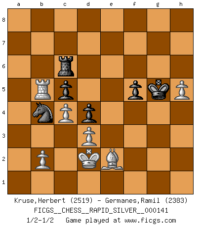Last move : 1/2-1/2 2014 June 16 1:4:26 [Event "FICGS__CHESS__RAPID_SILVER__000141"] [Site "FICGS"] [Date "2014.01.28"] [Round "1"] [White "Kruse,Herbert"] [Black "Germanes,Ramil"] [Result "1/2-1/2"] [WhiteElo "2519"] [BlackElo "2383"] 1.Nf3 Nf6 2.g3 d5 3.Bg2 c6 4.O-O Bg4 5.c4 e6 6.Qb3 Qb6 7.h3 Bxf3 8.Bxf3 Bc5 9.e3 d4 10.exd4 Bxd4 11.Na3 O-O 12.Nc2 e5 13.Nxd4 exd4 14.d3 Nbd7 15.Bf4 Rfe8 16.Qa3 Ne5 17.Bg2 Nfd7 18.Bd2 c5 19.f4 Nc6 20.Qb3 Qxb3 21.axb3 g6 22.g4 a6 23.Rfe1 Kf8 24.Rxe8+ Rxe8 25.Kf1 Rb8 26.Ke2 Nb4 27.Be4 b6 28.f5 Kg8 29.g5 a5 30.Bf4 Re8 31.Kd2 Ne5 32.Rf1 a4 33.Bxe5 Rxe5 34.bxa4 gxf5 35.Bxf5 Kg7 36.h4 h6 37.gxh6+ Kxh6 38.Be4 Kg7 39.Rf4 Rh5 40.Ke2 Nc2 41.Bf3 Re5+ 42.Kd2 Nb4 43.Rg4+ Kh8 44.Re4 Rf5 45.Be2 Kg7 46.Re7 Rf4 47.h5 Rf2 48.Rb7 Rf6 49.Rb8 Kh6 50.Ra8 Nc6 51.Rh8+ Kg7 52.Rc8 Kh6 53.Rc7 Kg5 54.Rb7 Nb4 55.Kd1 Kf4 56.Kd2 Kg5 57.a5 bxa5 58.Rb5 Rc6 59.Rxa5 f5 60.Rb5 1/2-1/2 Reti Opening Kingside Castling by player White (move 4) Kingside Castling by player Black (move 11) This chess game ended in a draw. Follow this game move after move (download)Not all artists are Chess players, but all Chess players are artists. (Marcel Duchamp) Ich rechne überhaupt nicht voraus. Ich gewinne auch so. (Robert James Fischer) El Ajedrez es un terrible juego. Si no controlas el centro, tu oponente tiene una posición mas holgada. Si tienes control del centro, ¡entonces realmente tu tienes algo de que preocuparte!. (Siegbert Tarrasch) Roi des jeux et jeu des rois, les échecs portent en eux un sentiment d'infini. Ils donnent à celui qui s'est efforcé d'en approfondir les arcanes l'impression de n'être pas à la mesure de l'homme; en fait, ils constituent un résumé de l'univers, un microcosme, et figurent cette grande échelle qui, dans les plans de la lumière descend jusqu'à la matière, qui des abîmes insondables remonte jusqu'en l'infini de Dieu. (Pyrame) There are three kinds of lies: lies, damned lies and statistics. (Mark Twain)