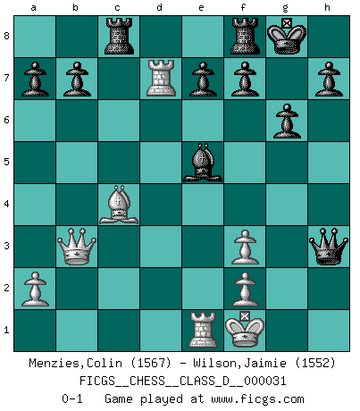Last move : 0-1 2007 March 11 21:18:35 [Event "FICGS__CHESS__CLASS_D__000031"] [Site "FICGS"] [Date "2007.02.12"] [Round "1"] [White "Menzies,Colin"] [Black "Wilson,Jaimie"] [Result "0-1"] [WhiteElo "1567"] [BlackElo "1552"] 1.c4 Nf6 2.Nf3 g6 3.d4 Bg7 4.Nc3 d5 5.cxd5 Nxd5 6.e4 Nxc3 7.bxc3 c5 8.Bc4 Nc6 9.Bb2 cxd4 10.cxd4 Bg4 11.Qb3 O-O 12.e5 Bxf3 13.gxf3 Nxd4 14.Bxd4 Qxd4 15.O-O Bxe5 16.Rfe1 Qf4 17.Rad1 Qxh2+ 18.Kf1 Rac8 19.Rd7 Qh3+ 0-1 English Opening Kingside Castling by player Black (move 11) Kingside Castling by player White (move 15) Player Black won this chess game. Follow this game move after move (download)The passed pawn is a criminal, who should be kept under lock and key. Mild measures, such as police surveillance, are not sufficient. (Nimzovitch) Smyslow ist ein Beweis dafür, dass ich noch zehn Jahre spielen kann! [der 75 jährige über den 85 jährigen] (Viktor Kortschnoi) Fischer es el jugador mas fuerte del mundo. De hecho, el jugador mas fuerte que jamas haya existido. (Larry Evans) Karpov est une pièce de musée. (Garry Kasparov) Go and wake up your luck. (Persian saying)