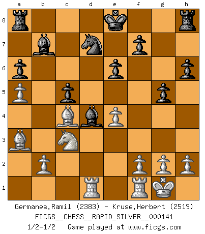 Last move : 1/2-1/2 2014 February 10 23:47:26 [Event "FICGS__CHESS__RAPID_SILVER__000141"] [Site "FICGS"] [Date "2014.01.28"] [Round "2"] [White "Germanes,Ramil"] [Black "Kruse,Herbert"] [Result "1/2-1/2"] [WhiteElo "2383"] [BlackElo "2519"] 1.d4 Nf6 2.c4 c6 3.Nf3 d5 4.Nc3 e6 5.Bg5 h6 6.Bh4 dxc4 7.e4 g5 8.Bg3 b5 9.Be2 Bb7 10.O-O Nbd7 11.Ne5 Bg7 12.Nxd7 Nxd7 13.Bd6 a6 14.a4 b4 15.Bxb4 Qb6 16.Ba3 Qxd4 17.a5 Qxd1 18.Raxd1 c5 19.Bxc4 Bd4 1/2-1/2 Queen's pawn game Kingside Castling by player White (move 10) This chess game ended in a draw. Follow this game move after move (download)Live, lose, and learn, by observing your opponent how to win. (Amber Steenbock) Die Jungen erwarten, dass Opa einfach umfällt. Dann aber kann Opa fünf Stunden lang Schach spielen und die jungen Gegner an die Wand drücken. (Viktor Kortschnoi) Mis oponentes también hacen buenas movidas. A veces yo no tomo esas cosas en consideración. (Bobby Fischer) Le jeu d'échecs est comme rejeté hors du temps. (Antoine de Saint-Exupéry) Philosophers use a language that is already deformed as though by shoes that are too tight. (Ludwig Wittgenstein)
