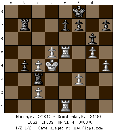 Last move : 1/2-1/2 2014 March 8 14:55:55 [Event "FICGS__CHESS__RAPID_M__000070"] [Site "FICGS"] [Date "2014.01.28"] [Round "1"] [White "Wosch,Arkadiusz"] [Black "Demchenko,Sergey"] [Result "1/2-1/2"] [WhiteElo "2101"] [BlackElo "2118"] 1.e4 c5 2.Nf3 d6 3.d4 cxd4 4.Nxd4 Nf6 5.Nc3 g6 6.Be3 Bg7 7.f3 O-O 8.Qd2 Nc6 9.Bc4 Bd7 10.O-O-O Rc8 11.Bb3 Nxd4 12.Bxd4 b5 13.Nd5 Nxd5 14.Bxg7 Kxg7 15.exd5 a5 16.a3 Kg8 17.Rhe1 Rc7 18.Re3 b4 19.axb4 axb4 20.Qd4 Rc5 21.Kd2 Qa5 22.Ke1 Re8 23.Re2 Rc7 24.Kf2 Qc5 25.Qxc5 dxc5 26.Bc4 Ra7 27.Rde1 Kf8 28.g4 Ba4 29.h4 Rb8 30.b3 Be8 31.g5 Rb6 32.Re5 Bb5 33.Bxb5 Rxb5 34.Ke3 R5b7 35.Kd3 c4+ 36.bxc4 Ra3+ 37.Kd4 Rc3 1/2-1/2 Sicilian : Dragon, Yugoslav attack, 7...O-O Kingside Castling by player Black (move 7) Queenside Castling by player White (move 10) This chess game ended in a draw. Follow this game move after move (download)Chess is a fairy tale of 1001 blunders. (Savielly Tartakower) Wie bekannt hörte Morphy 1859 auf, Schach zu spielen. Seine Enttäuschung galt nicht so sehr dem Schach, wie den Schachspielern. (Robert James Fischer) Diferente gente reacciona diferentemente en aceptar la derrota. (Bobby Fischer) On peut tirer plus d'utilité d'une partie perdue que de 100 parties gagnées. (Capablanca) A computer lets you make more mistakes faster than any invention in human history - with the possible exceptions of handguns and tequila. (Mitch Ratcliffe)