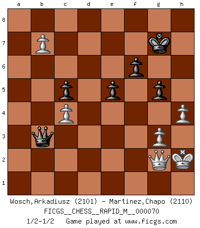 Last move : 1/2-1/2 2014 May 23 1:47:40 [Event "FICGS__CHESS__RAPID_M__000070"] [Site "FICGS"] [Date "2014.01.28"] [Round "1"] [White "Wosch,Arkadiusz"] [Black "Martinez,Chapo"] [Result "1/2-1/2"] [WhiteElo "2101"] [BlackElo "2110"] 1.e4 c5 2.Nf3 Nc6 3.d4 cxd4 4.Nxd4 Nf6 5.Nc3 e5 6.Ndb5 d6 7.Bg5 a6 8.Na3 b5 9.Nd5 Be7 10.Bxf6 Bxf6 11.c3 Bg5 12.Nc2 O-O 13.a4 bxa4 14.Rxa4 a5 15.Bc4 Bd7 16.O-O Ne7 17.Ra2 Rb8 18.Nce3 Nxd5 19.Nxd5 a4 20.Nb4 Qc8 21.Bd3 Bd8 22.Bc2 Ba5 23.Nd5 Qc4 24.Qa1 Bb6 25.Bxa4 Be6 26.Bc6 Kh8 27.Nxb6 Qxc6 28.Nd5 Bxd5 29.exd5 Qxd5 30.Rd1 Qe6 31.b4 Rfd8 32.Rad2 g6 33.Rd5 Kg7 34.Qc1 Qe7 35.Qd2 Rbc8 36.Re1 Qe6 37.Re3 Qe7 38.h3 Qc7 39.Rf3 h6 40.Kh2 Qe7 41.Re3 Qc7 42.f4 g5 43.fxg5 hxg5 44.b5 f6 45.Rf3 Qe7 46.Rfd3 Qc7 47.Qf2 Qe7 48.Qe2 Qc7 49.Rf3 Qd7 50.c4 Rc5 51.Rfd3 Qc7 52.Rxc5 dxc5 53.Rxd8 Qxd8 54.Qe4 Qd6 55.Kg3 Qd1 56.Qd5 Qb3+ 57.Kh2 Qe3 58.b6 Qf4+ 59.g3 Qf5 60.b7 Qb1 61.Qh1 Qc2+ 62.Qg2 Qb3 63.h4 1/2-1/2 Sicilian : Pelikan (Lasker/Sveshnikov) variation Kingside Castling by player Black (move 12) Kingside Castling by player White (move 16) This chess game ended in a draw. Follow this game move after move (download)It was clear to me that the vulnerable point of the American Grandmaster (Bobby Fischer) was in double-edged, hanging, irrational positions, where he often failed to find a win even in a won position. (Efim Geller) Kritik überlasse ich den Spießern. Ich zeige nichts, wofür ich mich schämen muss. (Alexandra Kosteniuk) De eso se trata el Ajedrez. Un día le das una lección a tu oponente y al día siguiente el te da una a tí. (Bobby Fischer) Aux échecs, les retours au sommet sont rares : les dommages psychologiques consécutifs à une défaite sont trop sévères. (Daily Telegraph) Live, lose, and learn, by observing your opponent how to win. (Amber Steenbock)
