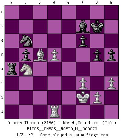 Last move : 1/2-1/2 2014 April 20 15:1:32 [Event "FICGS__CHESS__RAPID_M__000070"] [Site "FICGS"] [Date "2014.01.28"] [Round "1"] [White "Dineen,Thomas"] [Black "Wosch,Arkadiusz"] [Result "1/2-1/2"] [WhiteElo "2186"] [BlackElo "2101"] 1.d4 Nf6 2.c4 e6 3.Nc3 Bb4 4.e3 O-O 5.Bd3 d5 6.Nf3 c5 7.O-O Nc6 8.a3 Bxc3 9.bxc3 dxc4 10.Bxc4 Qc7 11.Bb5 a6 12.Bxc6 Qxc6 13.a4 cxd4 14.cxd4 Bd7 15.Ne5 Qc7 16.Ba3 Rfc8 17.Rc1 Qd8 18.Qb3 Rxc1 19.Rxc1 b5 20.axb5 axb5 21.Bc5 Ra4 22.Nd3 Be8 23.f3 h6 24.h3 Nd5 25.e4 Nb6 26.Qb2 Nc4 27.Qf2 f6 28.Rd1 Qa5 29.Qe1 Qxe1+ 30.Rxe1 g5 31.d5 exd5 32.exd5 Bf7 33.Nb4 Ne5 34.Rd1 Kg7 35.Kf2 h5 36.Bd6 Nc4 37.Be7 Nb6 38.Bc5 1/2-1/2 Nimzo-Indian : 4.e3 O-O, 5.Bd3 d5 Kingside Castling by player Black (move 4) Kingside Castling by player White (move 7) This chess game ended in a draw. Follow this game move after move (download)Play the opening like a book, the middle game like a magician, and the endgame like a machine. (Spielmann) Jede Eröffnung ist gut genug um gespielt zu werden, wenn nur ihr Ruf schlecht genug ist. (Savielly Grigorievitsch Tartakower) Del Ajedrez se ha dicho que la vida no es lo suficientemente larga para él, pero eso es culpa de la vida, no del Ajedrez. (William Ewart Napier) Il a essayé de se convaincre qu'il pourrait empêcher toutes les erreurs et ne jamais perdre. L'horreur ! Gary Kasparov au sujet de Robert Fischer. The age of a woman doesn't mean a thing. The best tunes are played on the oldest fiddles. (Ralph Waldo Emerson)