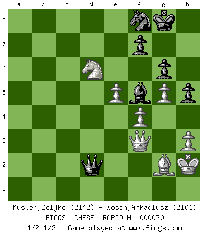 Last move : 1/2-1/2 2014 May 13 18:18:2 [Event "FICGS__CHESS__RAPID_M__000070"] [Site "FICGS"] [Date "2014.01.28"] [Round "1"] [White "Kuster,Zeljko"] [Black "Wosch,Arkadiusz"] [Result "1/2-1/2"] [WhiteElo "2142"] [BlackElo "2101"] 1.c4 Nf6 2.Nf3 g6 3.g3 Bg7 4.Bg2 O-O 5.d4 d6 6.O-O Nbd7 7.Nc3 e5 8.e4 c6 9.Rb1 a5 10.h3 Re8 11.Re1 exd4 12.Nxd4 Nc5 13.b3 Nfd7 14.Be3 Ne5 15.Qc2 Bf8 16.f4 Ned7 17.a3 Nf6 18.b4 axb4 19.axb4 Ne6 20.Rbd1 Qc7 21.g4 h5 22.g5 Nd7 23.Nxe6 Rxe6 24.Bd4 Bg7 25.Bxg7 Kxg7 26.Kh1 Nf8 27.Rd3 Re8 28.Qd2 Be6 29.Nd1 Kg8 30.Ne3 Qc8 31.Kh2 b5 32.Rxd6 bxc4 33.Rc1 Qb8 34.e5 Rc8 35.Nxc4 Ra4 36.Rxc6 Rxc6 37.Bxc6 Rxb4 38.Nd6 Rb2 39.Rc2 Rxc2 40.Qxc2 Qb6 41.Bg2 Qe3 42.Qe4 Qd2 43.Qf3 Bf5 1/2-1/2 English Opening Kingside Castling by player Black (move 4) Kingside Castling by player White (move 6) This chess game ended in a draw. Follow this game move after move (download)I'm not afraid of Spassky. The world knows I'm the best. You don't need a match to prove it. (Bobby Fischer) Zeige mir drei Eröffnungsvarianten und ich beweise dir, dass zwei davon inkorrekt sind. (Emanuel Lasker) El Ajedrez es realmente noventa y nueve por ciento calculación. (Soltis) Assurément je connaissais par expérience le mystérieux attrait de ce jeu royal, le seul entre tous les jeux inventés par les hommes qui échappe souverainement à la tyrannie du hasard, le seul où l'on ne doive sa victoire qu'à son intelligence ou plutôt à une certaine forme d'intelligence. Mais n'est-ce pas déjà le limiter injurieusement que d'appeler les échecs un jeu ? N'est-ce pas une science, un art ou quelque chose qui, comme le cercueil de Mahomet entre ciel et terre, est suspendu entre l'un et l'autre, et qui réunit un nombre incroyable de contraires ? [...] C'est une pensée qui ne mène à rien, une mathématique qui n'établit rien, un art qui ne laisse pas d'uvre, une architecture sans matière; et il l'a prouvé néanmoins qu'il était plus durable, à sa manière, que les livres ou que tout autre monument, ce jeu unique qui appartient à tous les peuples et à tous les temps, et dont personne ne sait quel dieu en fit don à la terre pour tuer l'ennui, pour aiguiser l'esprit et stimuler l'âme. Où commence-t-il, où finit-il ? (Stefan Zweig) The Internet is so big, so powerful and pointless that for some people it is a complete substitute for life. (Andrew Brown)