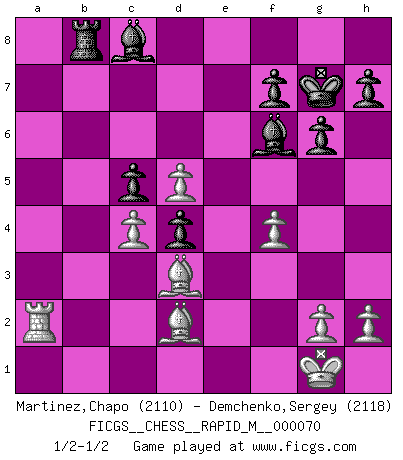 Last move : 1/2-1/2 2014 March 5 4:23:51 [Event "FICGS__CHESS__RAPID_M__000070"] [Site "FICGS"] [Date "2014.01.28"] [Round "1"] [White "Martinez,Chapo"] [Black "Demchenko,Sergey"] [Result "1/2-1/2"] [WhiteElo "2110"] [BlackElo "2118"] 1.d4 Nf6 2.c4 g6 3.Nc3 Bg7 4.e4 d6 5.Bd3 O-O 6.Nge2 Nc6 7.O-O e5 8.d5 Nd4 9.Rb1 Nd7 10.b4 a5 11.a3 axb4 12.axb4 c5 13.Nxd4 exd4 14.Nb5 Qe7 15.Bf4 Be5 16.Bd2 b6 17.f4 Bg7 18.Ra1 Rxa1 19.Qxa1 Nf6 20.bxc5 bxc5 21.Nxd6 Qxd6 22.e5 Qe7 23.exf6 Bxf6 24.Re1 Qd6 25.Qa7 Kg7 26.Rb1 Re8 27.Rb6 Qd7 28.Qxd7 Bxd7 29.Ra6 Rb8 30.Ra2 Bc8 1/2-1/2 King's Indian : 4.e4 Kingside Castling by player Black (move 5) Kingside Castling by player White (move 7) This chess game ended in a draw. Follow this game move after move (download)The winner of the game is the player who makes the next-to-last mistake. (Savielly Tartakover) Es gibt keine einzige Frau, der ich nicht einen Springer vorgeben könnte und trotzdem gewänne. (Robert James Fischer) Con el tiempo, empecé a progresar en partidas decisivas. Tal vez porque me di cuenta de una simple verdad: no solo estaba yo nervioso sino también mi oponente. (Mikhail Tal) Les Echecs ont trois composantes : le temps, l'espace et le matériel en dernier. (Mikhail Tal) Everything in life is luck. (Donald Trump)