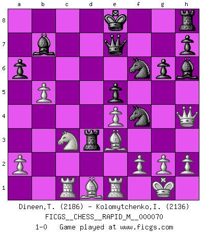 Last move : 1-0 2014 May 17 21:24:19 [Event "FICGS__CHESS__RAPID_M__000070"] [Site "FICGS"] [Date "2014.01.28"] [Round "1"] [White "Dineen,Thomas"] [Black "Kolomytchenko,Igor"] [Result "1-0"] [WhiteElo "2186"] [BlackElo "2136"] 1.d4 d5 2.c4 c6 3.Nc3 Nf6 4.Nf3 e6 5.e3 Nbd7 6.Bd3 dxc4 7.Bxc4 b5 8.Bd3 a6 9.e4 c5 10.d5 c4 11.dxe6 fxe6 12.Bc2 Qc7 13.O-O Bb7 14.Nd4 Nc5 15.Be3 e5 16.Nf5 g6 17.Nh6 Bg7 18.Qf3 Ne6 19.Qh3 Nd4 20.Bd1 Rd8 21.Re1 Qe7 22.Rc1 Ne6 23.b3 Rd3 24.bxc4 Nf4 25.Qh4 Bxh6 26.cxb5 1-0 This chess game has been lost on time (started : 2014.01.28 19:40:57) QGD Slav defense Kingside Castling by player White (move 13) Player White won this chess game. Follow this game move after move (download)On the chessboard, lies and hypocrisy do not survive long. (Emanuel Lasker) Wer mein Gambit spielt, muß bereit sein, alle Brücken hinter sich abzubrechen. Es verändert den ganzen Menschen. Es wirkt wie ein Zauberstab und fördert verkümmerte, gute Charakter- eigenschaften wieder zu Tage. (Emil Joseph Diemer) Yo siempre he tenido un ligero sentimiento de lástima por una persona que no tiene conocimiento del Ajedrez. (Siegbert Tarrasch) Toute estimation doit être constamment réévaluée. (Jacob Estrin) All the biggest technological inventions created by man - the airplane, the automobile, the computer - says little about his intelligence, but speaks volumes about his laziness. (Mark Kennedy)