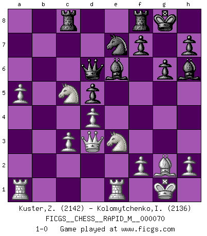 Last move : 1-0 2014 April 7 7:23:24 [Event "FICGS__CHESS__RAPID_M__000070"] [Site "FICGS"] [Date "2014.01.28"] [Round "1"] [White "Kuster,Zeljko"] [Black "Kolomytchenko,Igor"] [Result "1-0"] [WhiteElo "2142"] [BlackElo "2136"] 1.Nf3 Nf6 2.g3 d5 3.Bg2 g6 4.O-O Bg7 5.d3 O-O 6.Nbd2 c5 7.e4 Nc6 8.c3 Qc7 9.Re1 e6 10.exd5 exd5 11.Nb3 b6 12.d4 c4 13.Bf4 Qb7 14.Nbd2 Be6 15.Ne5 b5 16.a4 a6 17.b3 Nh5 18.bxc4 Nxf4 19.gxf4 bxc4 20.Ndxc4 Rad8 21.Ne3 Qc7 22.Nd3 Ne7 23.Nc5 Rc8 24.Qd3 Qxf4 25.Nxa6 Qd6 26.a5 Bh6 27.Nc5 1-0 This chess game has been lost on time (started : 2014.01.28 19:40:57) Reti Opening Kingside Castling by player White (move 4) Kingside Castling by player Black (move 5) Player White won this chess game. Follow this game move after move (download)In Chess, just as in life, today's bliss may be tomorrow's poison. (Assaic) Offener Brief an US-Präsident Bush anlässlich der Verhaftung Bobby Fishers: Verhaften Sie mich. Stecken Sie mich in dieselbe Zelle wie Bobby Fisher und geben Sie uns ein Schachspiel mit. (Boris Vassilievich Spassky) ¿Esta Bobby Fischer algo cuerdo?. (Salo Flohr) Comme les marins qui ont mille raisons différentes d'aller en mer, les joueurs d'échecs en ont tout autant avant de s'installer devant une table et jouer... (Vincent Bertignac, philosophe) The difference between perseverance and obstinacy is that one comes from a strong will, and the other from a strong won't. (Henry Ward Beecher)