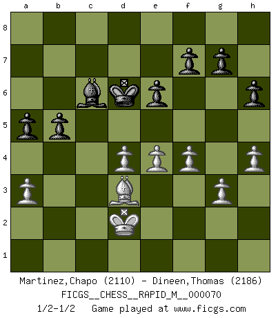 Last move : 1/2-1/2 2014 March 18 23:57:7 [Event "FICGS__CHESS__RAPID_M__000070"] [Site "FICGS"] [Date "2014.01.28"] [Round "1"] [White "Martinez,Chapo"] [Black "Dineen,Thomas"] [Result "1/2-1/2"] [WhiteElo "2110"] [BlackElo "2186"] 1.d4 Nf6 2.c4 e6 3.Nf3 b6 4.a3 Bb7 5.Nc3 d5 6.cxd5 Nxd5 7.Qc2 Nxc3 8.bxc3 c5 9.e4 Nd7 10.Bf4 cxd4 11.cxd4 Rc8 12.Qb3 Be7 13.Bd3 Nf6 14.Qb5+ Bc6 15.Qb1 O-O 16.O-O Qd7 17.Re1 Ba4 18.Bd2 h6 19.Qb2 Rfd8 20.Bb4 Rc7 21.Rac1 Rdc8 22.Rxc7 Rxc7 23.Ne5 Qd8 24.Bxe7 Qxe7 25.Rc1 Rxc1+ 26.Qxc1 Nd7 27.Nxd7 Bxd7 28.Qc3 Qd6 29.g3 a5 30.Kf1 Qc6 31.Qxc6 Bxc6 32.Ke2 Kf8 33.Kd2 Ke7 34.f4 Kd6 35.h4 b5 1/2-1/2 Queen's Indian : Petrosian system Kingside Castling by player Black (move 15) Kingside Castling by player White (move 16) This chess game ended in a draw. Follow this game move after move (download)He who takes the Queen's Knight's Pawn will sleep in the streets. (Anonymous) Wenn Du absolut nicht mehr weißt, was Du tun sollst, dann ist es Zeit für Panik. (John van der Wiel) El Ajedrez es tan interesante por sí solo, que no es necesario un interés monetario para persuadir a una persona a que lo practique; por lo tanto, nunca se juega por dinero. (Benjamin Franklin) Si le désir cupide (et stupide) de gagner est une inépuisable source de souffrance, une combinaison brillante sur l'échiquier est une découverte : le coquelicot qui s'épanouit lorsque apparaît la Voie Lactée. (Arrabal) There is no vagueness without wind. (Chinese proverb)
