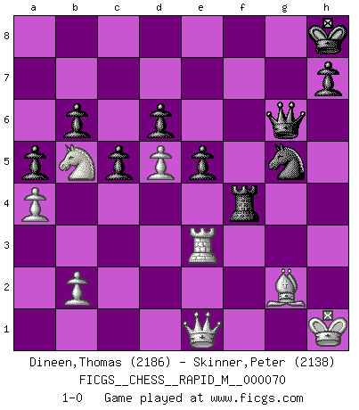 Last move : 1-0 2014 June 15 23:6:24 [Event "FICGS__CHESS__RAPID_M__000070"] [Site "FICGS"] [Date "2014.01.28"] [Round "1"] [White "Dineen,Thomas"] [Black "Skinner,Peter"] [Result "1-0"] [WhiteElo "2186"] [BlackElo "2138"] 1.d4 Nf6 2.c4 g6 3.Nc3 c5 4.d5 Bg7 5.e4 O-O 6.Nf3 d6 7.h3 a6 8.a4 e6 9.Bd3 exd5 10.cxd5 Nbd7 11.O-O Nh5 12.Re1 b6 13.Bg5 Bf6 14.Be3 Ne5 15.Be2 Nxf3+ 16.Bxf3 Ng7 17.Qd2 Be5 18.Bf4 f6 19.Rab1 g5 20.Bxe5 fxe5 21.Be2 a5 22.Rf1 Rf4 23.Qe3 Qf6 24.Ra1 Rh4 25.Ra3 Qh6 26.Nb5 Bd7 27.Rc1 Qg6 28.f3 Rf8 29.Bf1 Rhf4 30.Na7 Kh8 31.Bb5 Bxh3 32.gxh3 Nh5 33.Qe1 Rxf3 34.Rxf3 Rxf3 35.Rc3 g4 36.Bf1 Rf4 37.Nb5 gxh3 38.Kh1 Nf6 39.Bxh3 Nxe4 40.Re3 Ng5 41.Bg2 1-0 This chess game has been lost on time (started : 2014.01.28 19:40:57) King's Indian defense, 3.Nc3 Kingside Castling by player Black (move 5) Kingside Castling by player White (move 11) Player White won this chess game. Follow this game move after move (download)If your opponent offers you a draw, try to work out why he thinks he's worse off. (Nigel Short) Wenn Capablanka heute auf der Schachbühne erscheinen würde, hätte er ein halbes Jahr gebraucht um sich die Schachtheorie anzueignen. Und dann hätte er alles und jeden besiegt. (Mikhail Moiseyevich Botvinik) Yo he agregado estos principios a la ley: pongan los Caballos en acción antes de que los dos Alfiles sean desarrollados. (Emanuel Lasker) L'action d'une oeuvre littéraire se déroule sur un champ de bataille. Les masques et les types du drame moderne correspondent aux pièces du jeu d'échecs. L'intrigue correspond aux coups et aux gambits, c'est à dire aux techniques du jeu telles qu'utilisées et interprétées par les joueurs. Les tactiques et les péripéties [mouvements] correspondent aux coups exécutés par l'adversaire. (Viktor Shklovsky) You must have a dream in order to have it come true. (A.P.J. Kalam)