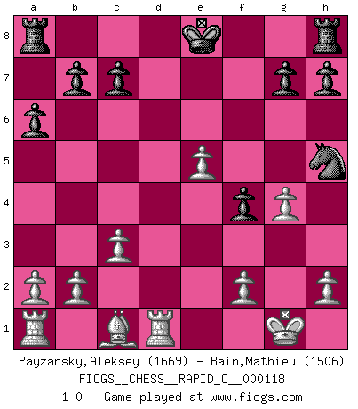 Last move : 1-0 2014 April 17 7:53:35 [Event "FICGS__CHESS__RAPID_C__000118"] [Site "FICGS"] [Date "2014.01.31"] [Round "1"] [White "Payzansky,Aleksey"] [Black "Bain,Mathieu"] [Result "1-0"] [WhiteElo "1669"] [BlackElo "1506"] 1.e4 e6 2.d4 d5 3.Nc3 Nc6 4.Nf3 a6 5.exd5 exd5 6.Bd3 Bb4 7.Bg5 f6 8.Bf4 Qe7+ 9.Be3 Bg4 10.O-O f5 11.Nxd5 Qd6 12.Nxb4 Nxb4 13.Be2 Nf6 14.c3 f4 15.Bc1 Nc6 16.Ne5 Nxe5 17.dxe5 Qxd1 18.Bxd1 Bxd1 19.Rxd1 Nh5 20.g4 1-0 This chess game has been lost on time (started : 2014.01.31 11:51:41) French : Paulsen variation Kingside Castling by player White (move 10) Player White won this chess game. Follow this game move after move (download)Chess is played with the mind and not with the hands ! (Renaud and Kahn) Stelle das Brett so, daß die Sonne in die Augen deines Gegners scheint. (Ruy López) Nunca antes ha habido un jugador de Ajedrez con tal conocimiento a fondo de las complejidades del juego y una inmensa voluntad absolutamente indomable de ganar. Yo pienso que Fischer es el jugador mas grande que jamás haya existido. (Lisa Lane) Aux échecs, les retours au sommet sont rares : les dommages psychologiques consécutifs à une défaite sont trop sévères. (Daily Telegraph) Memory... is the diary that we all carry with us. (Oscar Wilde, The Importance of Being Earnest)