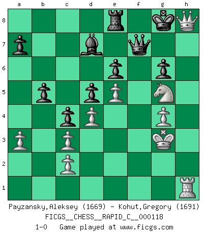 Last move : 1-0 2014 June 3 10:36:11 [Event "FICGS__CHESS__RAPID_C__000118"] [Site "FICGS"] [Date "2014.01.31"] [Round "1"] [White "Payzansky,Aleksey"] [Black "Kohut,Gregory"] [Result "1-0"] [WhiteElo "1669"] [BlackElo "1691"] 1.e4 e6 2.d4 d5 3.Nc3 Bb4 4.e5 c5 5.a3 Bxc3+ 6.bxc3 Ne7 7.Qg4 O-O 8.Bd3 Nbc6 9.Qh5 Ng6 10.Nf3 Qc7 11.O-O c4 12.Bxg6 fxg6 13.Qh3 Qa5 14.Bd2 Bd7 15.Ng5 h6 16.Nf3 Rf7 17.Qg4 Ne7 18.Rfe1 g5 19.Reb1 b6 20.h4 gxh4 21.Bxh6 Nf5 22.Bd2 Raf8 23.Rb4 Qa6 24.Qh3 Qc8 25.Ng5 Re7 26.g4 Nh6 27.Qxh4 Qe8 28.Nh3 Nf7 29.Kg2 Qd8 30.Bg5 Nxg5 31.Nxg5 g6 32.Rh1 Rxf2+ 33.Kxf2 Qf8+ 34.Kg3 Qg7 35.R4b1 Re8 36.Rbf1 b5 37.Rf7 Qxf7 38.Qh8+ 1-0 This chess game has been lost on time (started : 2014.01.31 11:51:41) French : Winawer, Advance, poisoned pawn variation Kingside Castling by player Black (move 7) Kingside Castling by player White (move 11) Player White won this chess game. Follow this game move after move (download)Chess demands total concentration. (Bobby Fischer) Man braucht nicht immer den besten Zug zu spielen: Ein Zug muß aktiv, unternehmungslustig, korrekt und schön sein. (David Bronstein) Robert Fischer es la ley hacia si mismo. (Larry Evans) Karpov est une pièce de musée. (Garry Kasparov) The greatest con, that he ever pulled... was making you believe... that he is you. (Revolver, movie)