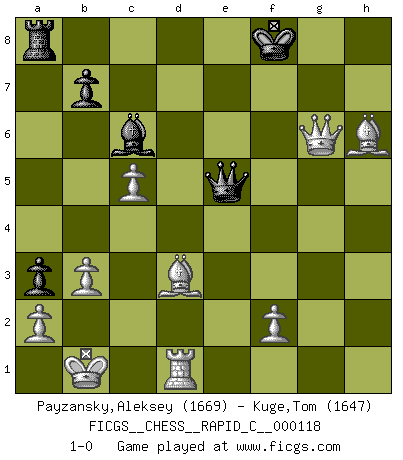 Last move : 1-0 2014 February 7 5:43:43 [Event "FICGS__CHESS__RAPID_C__000118"] [Site "FICGS"] [Date "2014.01.31"] [Round "1"] [White "Payzansky,Aleksey"] [Black "Kuge,Tom"] [Result "1-0"] [WhiteElo "1669"] [BlackElo "1647"] 1.e4 e6 2.d4 d5 3.Nc3 dxe4 4.Nxe4 Be7 5.Nf3 Nf6 6.Bd3 O-O 7.Qe2 a5 8.Nxf6+ Bxf6 9.Qe4 g6 10.Bh6 Re8 11.O-O-O a4 12.h4 Nc6 13.h5 a3 14.b3 Nb4 15.Kb1 c5 16.hxg6 fxg6 17.dxc5 Nd5 18.Bd2 Bg7 19.Rxh7 Qf6 20.Rxg7+ Kxg7 21.Ne5 Rh8 22.c4 Rh4 23.g4 Bd7 24.cxd5 exd5 25.Qxd5 Bc6 26.Qc4 Rxg4 27.Qxg4 Qxe5 28.Qxg6+ Kf8 29.Bh6+ 1-0 French : Rubinstein variation Kingside Castling by player Black (move 6) Queenside Castling by player White (move 11) Player White won this chess game. Follow this game move after move (download)I don't believe in psychology. I believe in good moves. (Bobby Fischer) Schachspieler können ausgezeichnet Varianten am Schachbrett berechnen, aber nicht im realen Leben. Zu stark ist der Individualismus im Schach ausgeprägt, und für viele ist ein kleiner momentaner persönlicher Vorteil wichtiger als ein weit größerer Vorteil von morgen. (Anatoly Karpov) Antes de los Finales, los dioses han colocado el Juego Medio. (Siegbert Tarrasch) Donnez-moi un Cavalier en 6e et je gagnerais toutes mes parties. (Steinitz) There is a very easy way to return from a casino with a small fortune : go there with a large one. (Jack Yelton)