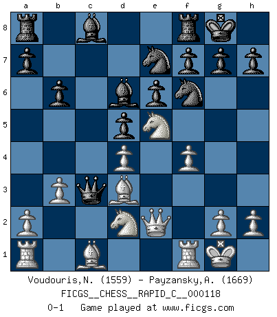 Last move : 0-1 2014 February 14 9:25:17 [Event "FICGS__CHESS__RAPID_C__000118"] [Site "FICGS"] [Date "2014.01.31"] [Round "1"] [White "Voudouris,Nick"] [Black "Payzansky,Aleksey"] [Result "0-1"] [WhiteElo "1559"] [BlackElo "1669"] 1.d4 Nf6 2.f4 d5 3.e3 e6 4.Bd3 c5 5.c3 Nc6 6.Nf3 cxd4 7.exd4 Bd6 8.O-O O-O 9.Qe2 b6 10.b3 Ne7 11.Nbd2 Qc7 12.Ne5 Qxc3 0-1 Canard Opening Kingside Castling by player White (move 8) Kingside Castling by player Black (move 8) Player Black won this chess game. Follow this game move after move (download)The boy (then a 12 year old boy named Anatoly Karpov) doesn't have a clue about Chess, and there's no future at all for him in this profession. (Mikhail Botvinnik) Es gibt Leute, die glauben, alles wäre vernünftig, was man mit einem ernsthaften Gesicht tut. (Georg Christoph Lichtenberg) Cuando tengas duda... ¡juega al Ajedrez!. (Tevis) Même un GMI sait rarement calculer sur plus de cinq coups une attaque à sacrifices. (Rudolf Spielmann) Crush them ! Make them suffer ! (General Grievous in Star Wars ep.3)