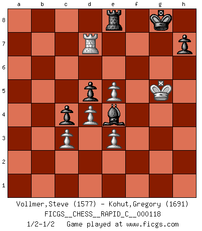Last move : 1/2-1/2 2014 April 26 21:44:54 [Event "FICGS__CHESS__RAPID_C__000118"] [Site "FICGS"] [Date "2014.01.31"] [Round "1"] [White "Vollmer,Steve"] [Black "Kohut,Gregory"] [Result "1/2-1/2"] [WhiteElo "1577"] [BlackElo "1691"] 1.e4 e6 2.d4 d5 3.Nc3 Bb4 4.e5 c5 5.a3 Bxc3+ 6.bxc3 Ne7 7.Nf3 Nbc6 8.Bd3 Qa5 9.Bd2 c4 10.Be2 Bd7 11.O-O Nf5 12.Qc1 O-O 13.Qb2 b6 14.Rfb1 Rab8 15.a4 Qa6 16.Qa3 Rfe8 17.h3 Qc8 18.Nh2 Qc7 19.Be3 Nxe3 20.fxe3 Rf8 21.Rf1 f5 22.Rf2 Qd8 23.Qd6 Qe7 24.Qxe7 Nxe7 25.Nf1 Nc6 26.Ng3 Na5 27.Nh5 b5 28.axb5 Rxb5 29.Nf4 Nc6 30.Ra6 Ra5 31.Rxa5 Nxa5 32.g4 g6 33.gxf5 gxf5 34.Nh5 Be8 35.Nf6+ Kg7 36.Rg2+ Bg6 37.h4 Kh8 38.h5 Be8 39.h6 Bg6 40.Bh5 Bxh5 41.Rg7 Bg6 42.Rxa7 Nc6 43.Rc7 Nd8 44.Kf2 Nf7 45.Re7 Nxh6 46.Rxe6 Ng4+ 47.Nxg4 fxg4 48.Kg3 Bxc2 49.Rd6 Be4 50.Kxg4 Rg8+ 51.Kh4 Re8 52.Kg5 Kg7 53.Rd7+ Kg8 54.Kf6 Rf8+ 55.Kg5 Re8 56.Kf6 Rf8+ 57.Kg5 Re8 1/2-1/2 French : Winawer, Advance, positional Main line Kingside Castling by player White (move 11) Kingside Castling by player Black (move 12) This chess game ended in a draw. Follow this game move after move (download)Even the laziest King flees wildly in the face of a double check ! (Aaron Nimzowitsch) Dein Körper muss in Topform sein. Dein Schach verfällt, wenn dein Körper verfällt. Der Körper kann nicht vom Geist getrennt werden. (Robert James Fischer) Botvinnik trató de alejar el misterio referente al Ajedrez, siempre relacionandolo a situaciones de la vida diaria. Solía llamar al Ajedrez un problema inexacto típico, similar a aquellos en que la gente tiene siempre que resolver a cada día. (Garry Kasparov) Je ne suis pas le dernier à jouer lâchement des coups douteux pendant le zeïtnot de l'adversaire pour l'achever: en effet les coups qui font le plus peur sont ceux que l'on ne comprend pas. Je me fais souvent peur quand je joue. (Un professeur anonyme) Life is like a game of cards: the hand you are dealt represents determinism; the way you play it is free will. (Jawaharlal Nehru)