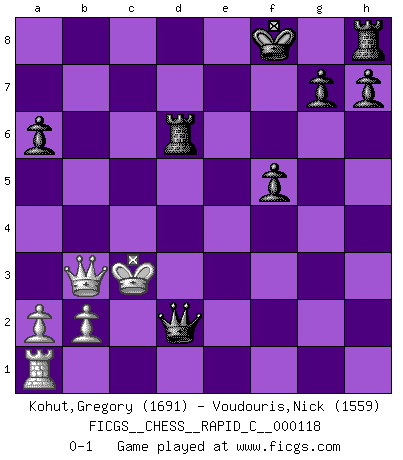 Last move : 0-1 2014 March 22 14:31:13 [Event "FICGS__CHESS__RAPID_C__000118"] [Site "FICGS"] [Date "2014.01.31"] [Round "1"] [White "Kohut,Gregory"] [Black "Voudouris,Nick"] [Result "0-1"] [WhiteElo "1691"] [BlackElo "1559"] 1.e4 c5 2.Nf3 f5 3.exf5 Nc6 4.d4 d5 5.Bb5 Bxf5 6.dxc5 Nf6 7.Nc3 a6 8.Bxc6+ bxc6 9.O-O Qc7 10.Re1 e6 11.Nd4 Kf7 12.Nxf5 exf5 13.Be3 Ng4 14.Nxd5 Qxh2+ 15.Kf1 Rd8 16.c4 cxd5 17.cxd5 Qh1+ 18.Ke2 Qxg2 19.d6 Nxe3 20.Kxe3 Bxd6 21.Qb3+ Kf8 22.cxd6 Qe4+ 23.Kd2 Rxd6+ 24.Kc3 Qd4+ 25.Kc2 Qd2+ 26.Kb1 Qxe1+ 27.Kc2 Qxf2+ 28.Kc3 Qd2+ 0-1 Sicilian defense Kingside Castling by player White (move 9) Player Black won this chess game. Follow this game move after move (download)What would Chess be without silly mistakes ? (Kurt Richter) Ich spiele 70 Eröffnungssysteme. (Viktor Kortschnoi) Fischer no está bajo la obligación de nadie. (Joseph Platz) Tout change constamment, y compris dans le monde des Echecs. (Botvinnik) The quality of decision is like the well-timed swoop of a falcon which enables it to strike and destroy its victim. (Sun Tzu)