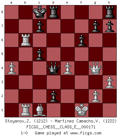 Last move : 1-0 2014 February 20 19:41:10 [Event "FICGS__CHESS__CLASS_E__000171"] [Site "FICGS"] [Date "2014.01.31"] [Round "1"] [White "Stoyanov,Zdravko"] [Black "Martinez Camacho,Victor Hugo"] [Result "1-0"] [WhiteElo "1212"] [BlackElo "1222"] 1.e4 e5 2.Nf3 Nc6 3.Bb5 a6 4.Bxc6 dxc6 5.h3 f6 6.O-O Be6 7.Re1 Bc5 8.d3 Qd7 9.Kh2 O-O-O 10.a3 Bxf2 11.Re2 Bc5 12.b4 Bd6 13.Nbd2 Ne7 14.c4 c5 15.b5 axb5 16.cxb5 Qxb5 17.Nc4 Nc6 18.Rb2 Qa6 19.Rb3 Nd4 20.Nxd4 exd4 21.Kg1 Bxc4 22.dxc4 Qxc4 23.Rab1 b6 24.Rb5 d3 25.a4 Qd4+ 26.Kf1 Bg3 27.Qg4+ Kb8 28.Qxg3 d2 29.Rxb6+ Kc8 30.Qg4+ 1-0 Ruy Lopez : Exchange variation Kingside Castling by player White (move 6) Queenside Castling by player Black (move 9) Player White won this chess game. Follow this game move after move (download)In Chess, just as in life, today's bliss may be tomorrow's poison. (Assaic) Verschiedene, sehr schätzbare und im Laufe des Lebens nützliche Eigenschaften des Geistes können durch das Schachspiel erworben und gekräftigt werden, so dass sie zu Gewohnheiten werden, die uns nie im Stich lassen. (Benjamin Franklin) Vive, pierde y aprende al observar a tu oponente como ganar. (Amber Steenbock) Toutes choses étant égales, c'est la conviction qui gagne. Alliée à une volonté de vaincre, elle sert de détonateur, suscite des idées, disperse les doutes et aide à penser clairement. (Robert Fischer) This is where the fun begins. (Anakin Skywalker in Star Wars ep.3)